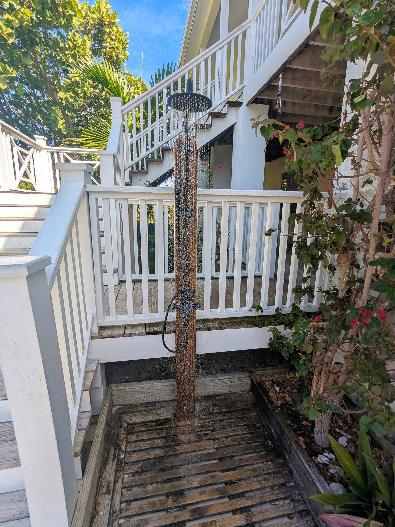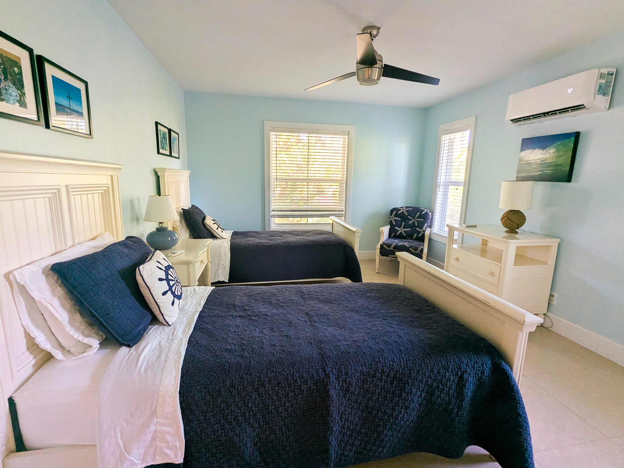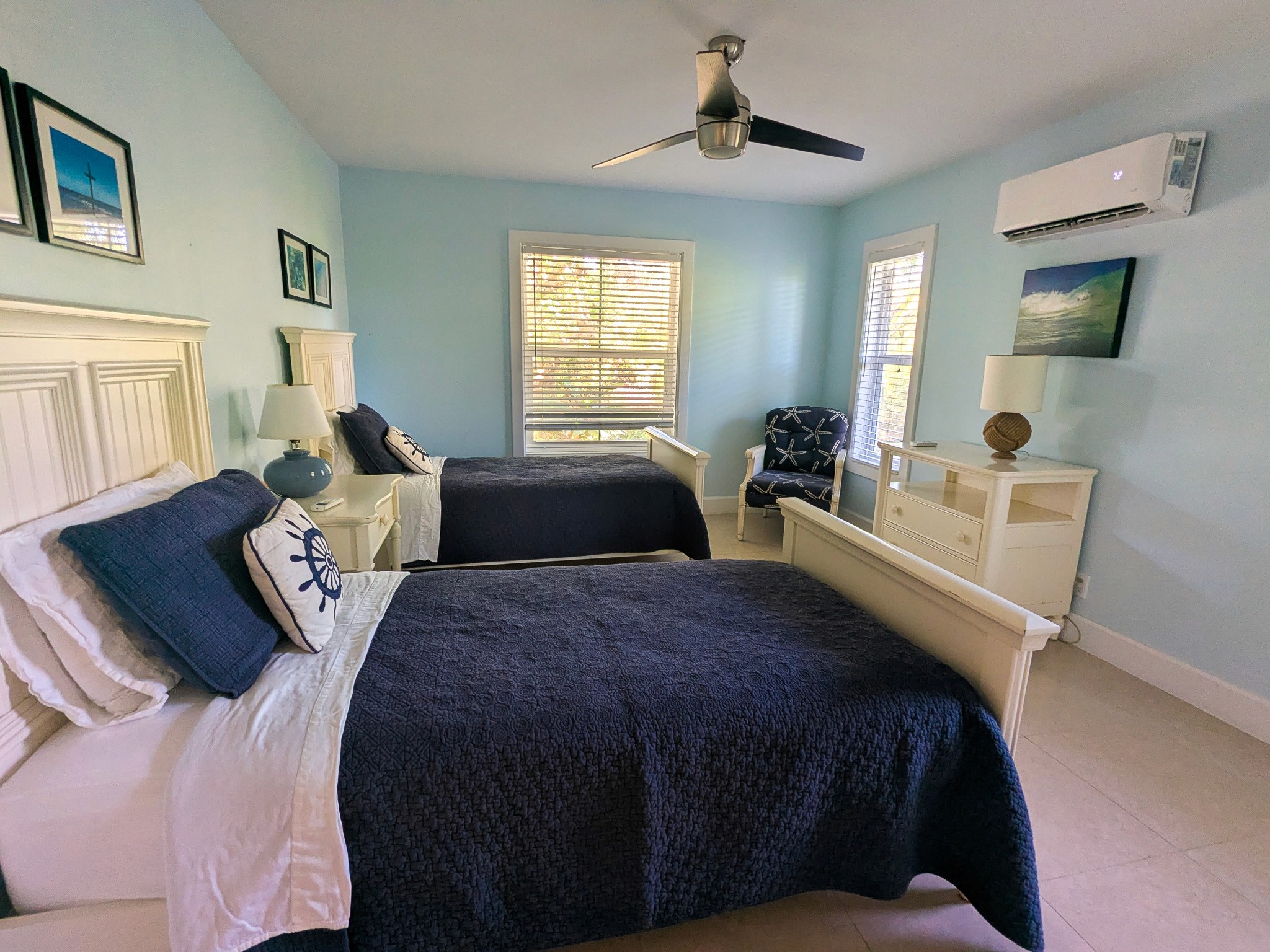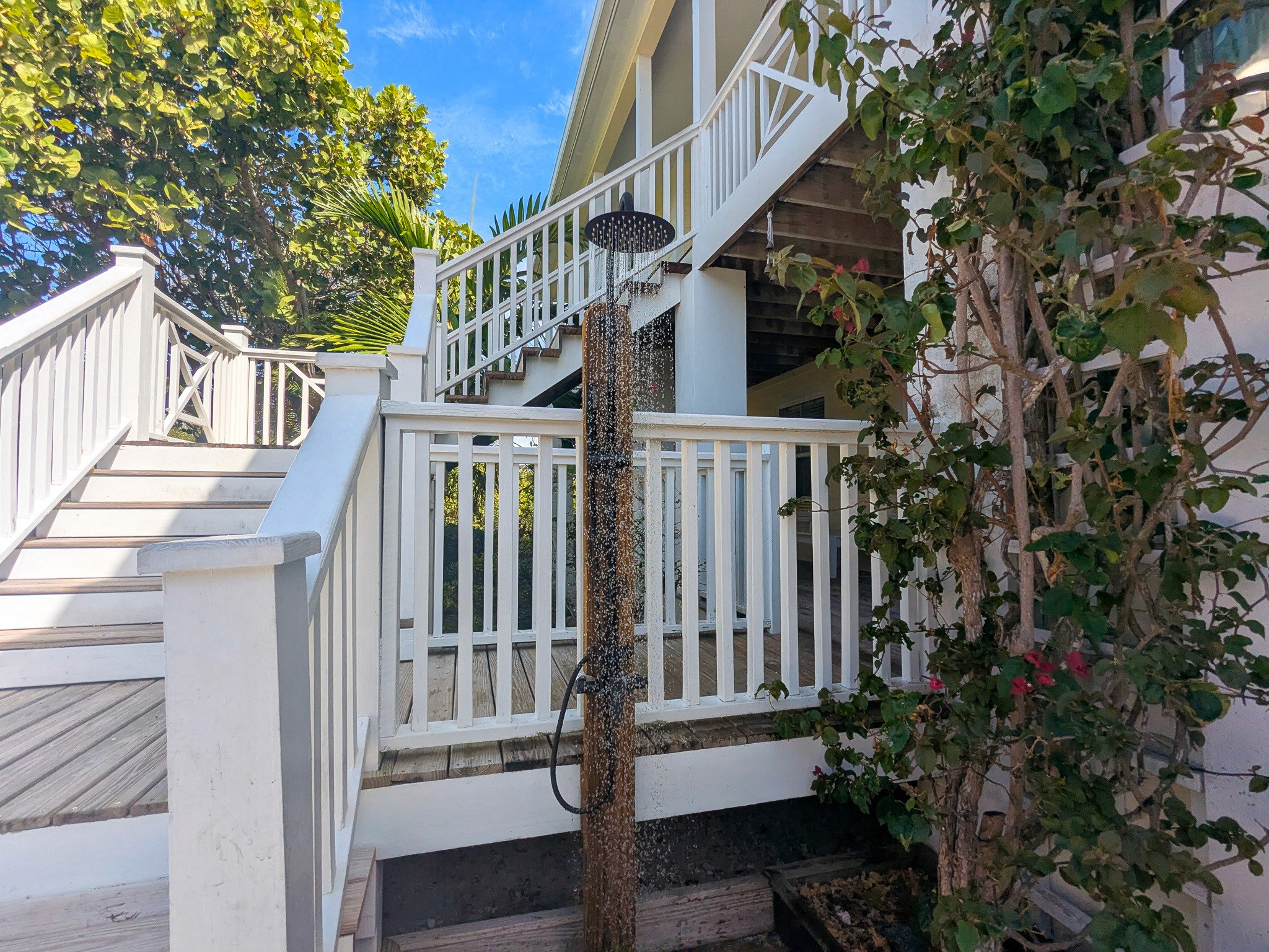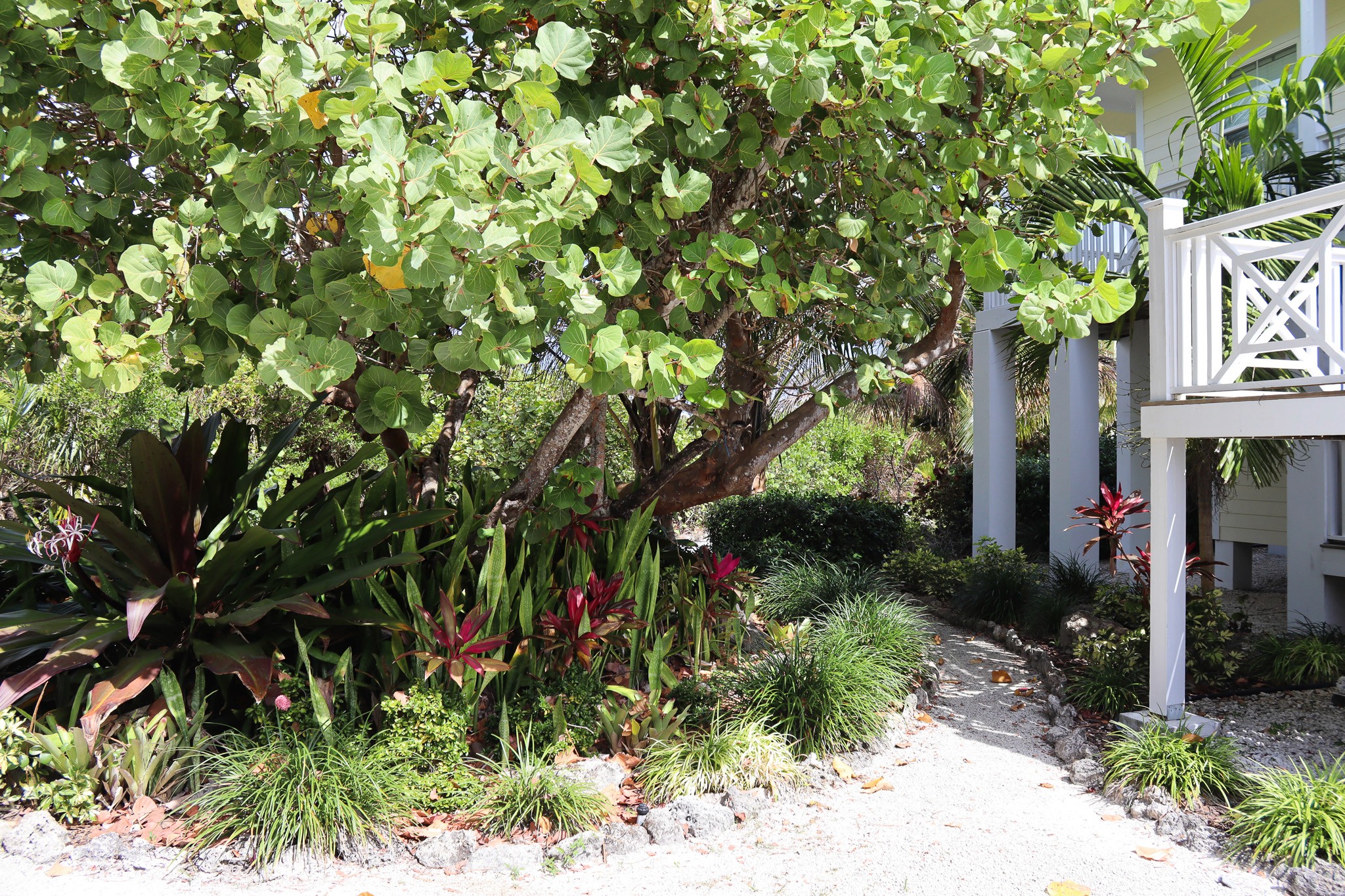 The home is designed with your comfort in mind, whether it’s enjoying the garden/ocean setting from inside or out on the wrap-around veranda. The main level has a master suite with a king-size bed and ensuite bathroom, a second bedroom with a queen-size bed and bathroom adjacent, a den with a daybed, comfortably sleeping 5. The lower level has a bathroom and two bedrooms, one with a queen-size bed and the other with two twin beds, sleeping an additional 4 people.