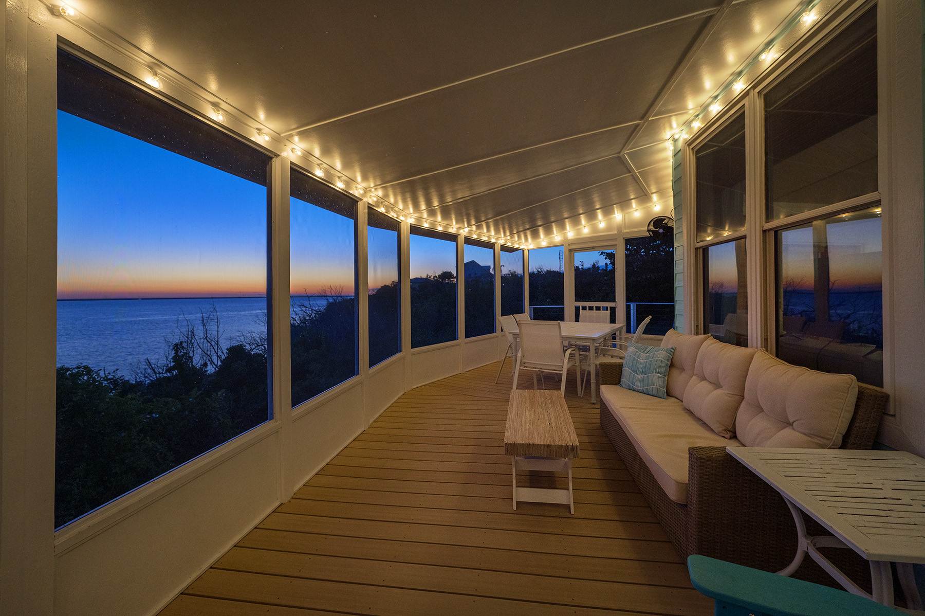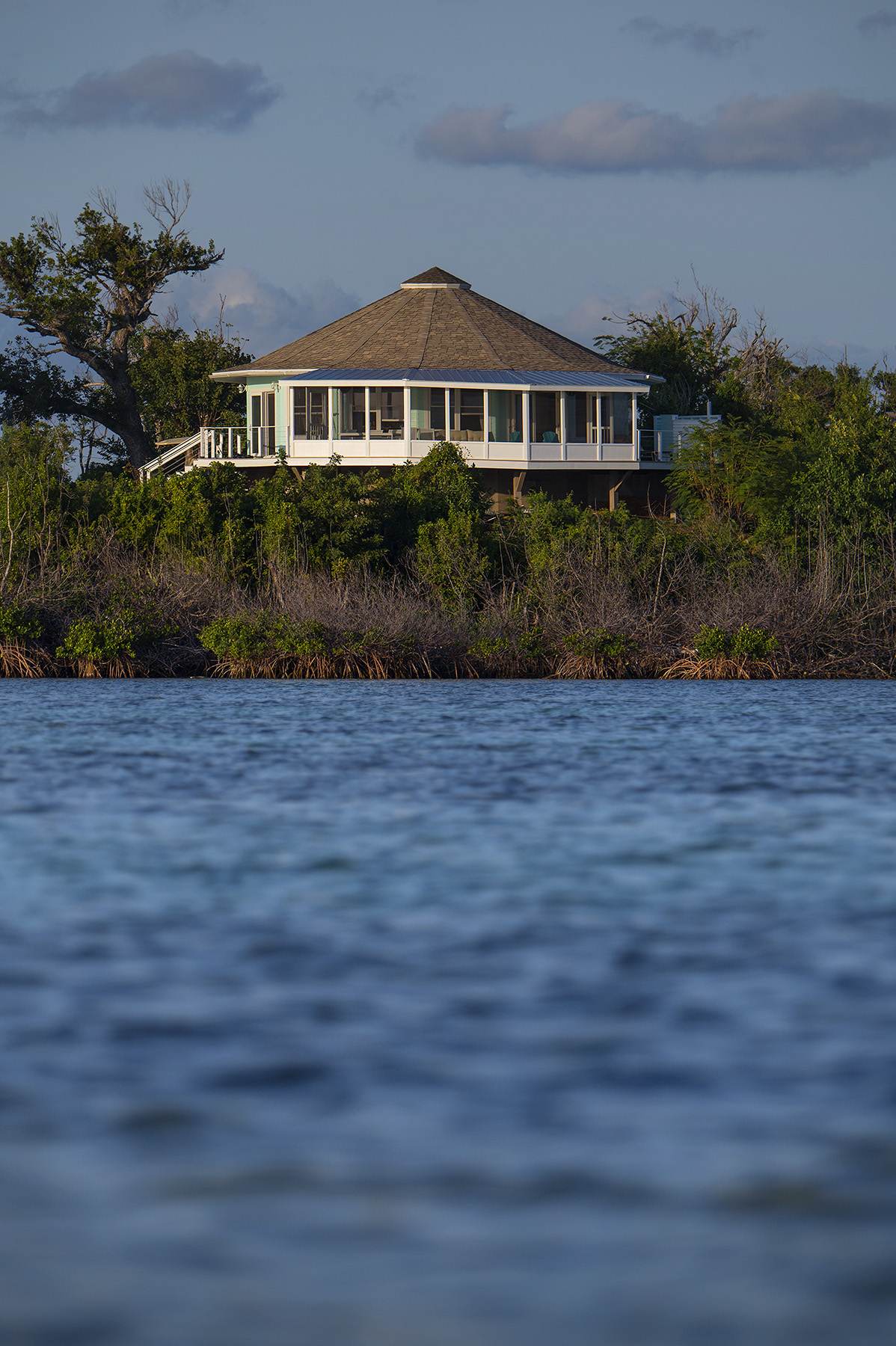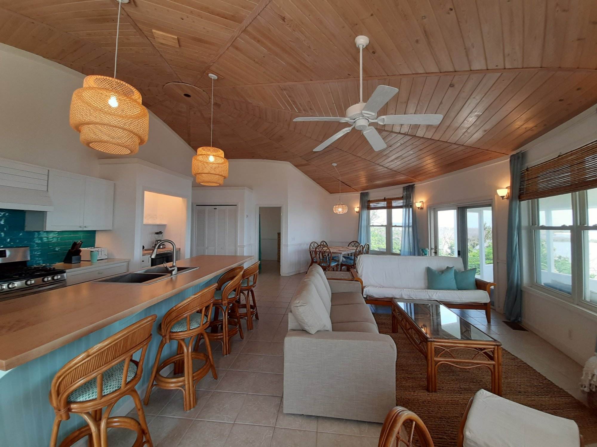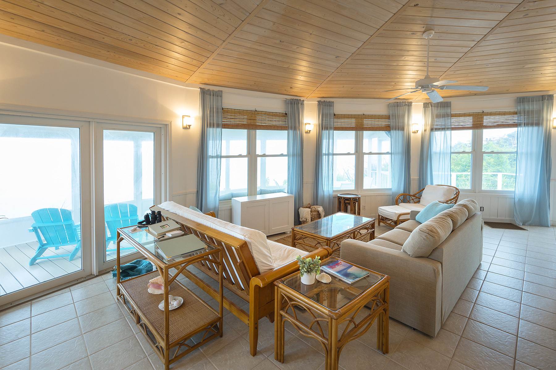 The main living room features a soaring ceiling and a wall of windows, which highlight the sweeping views of the Sea of Abaco from its screened porch.