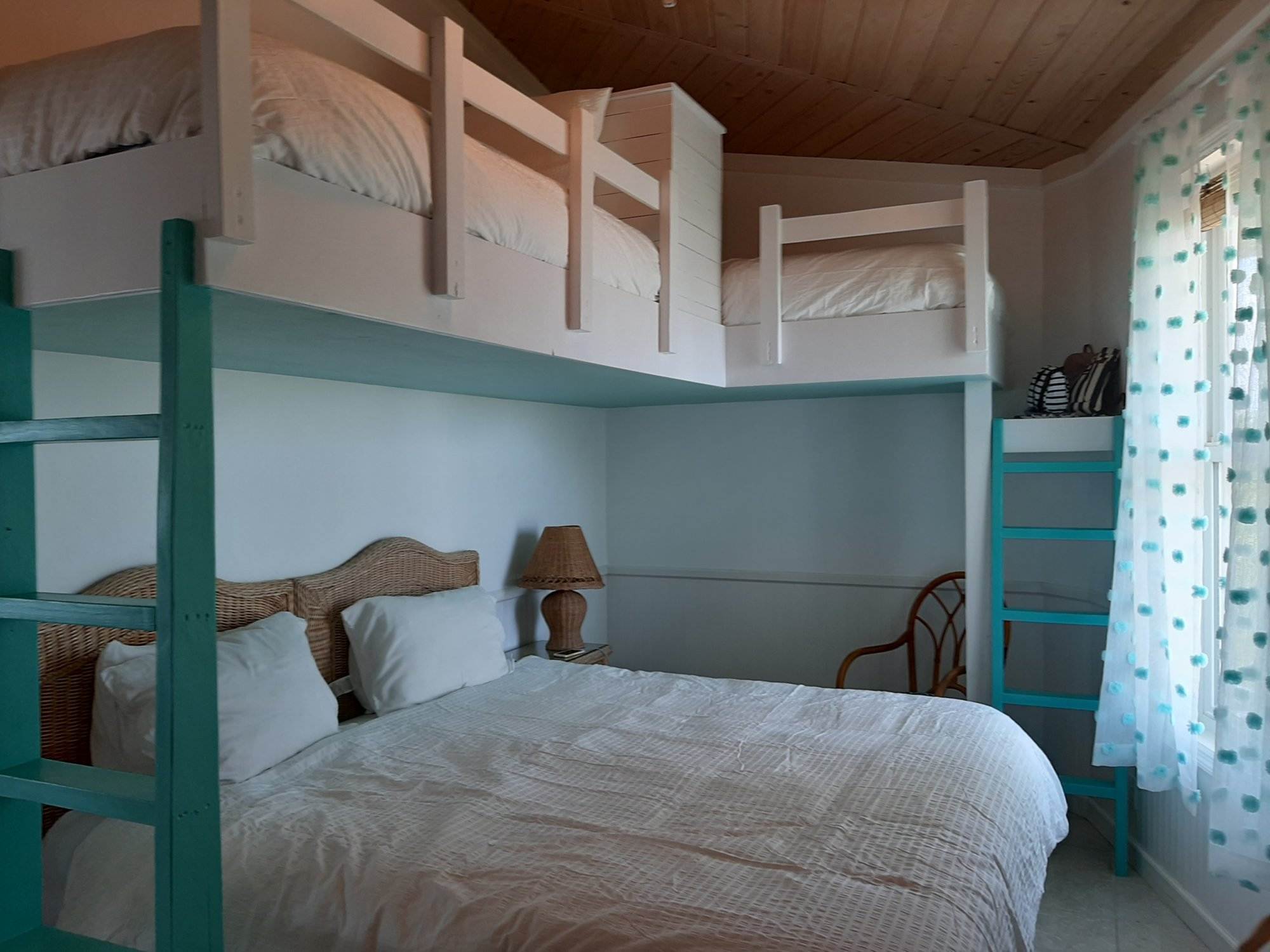 The house has 2 bedrooms and 2 bathrooms. The master is open and airy, with a little romantic touch, and a large ensuite bathroom. The guest room is perfect for a couple or up to four people, with a king bed and two twin lofts.