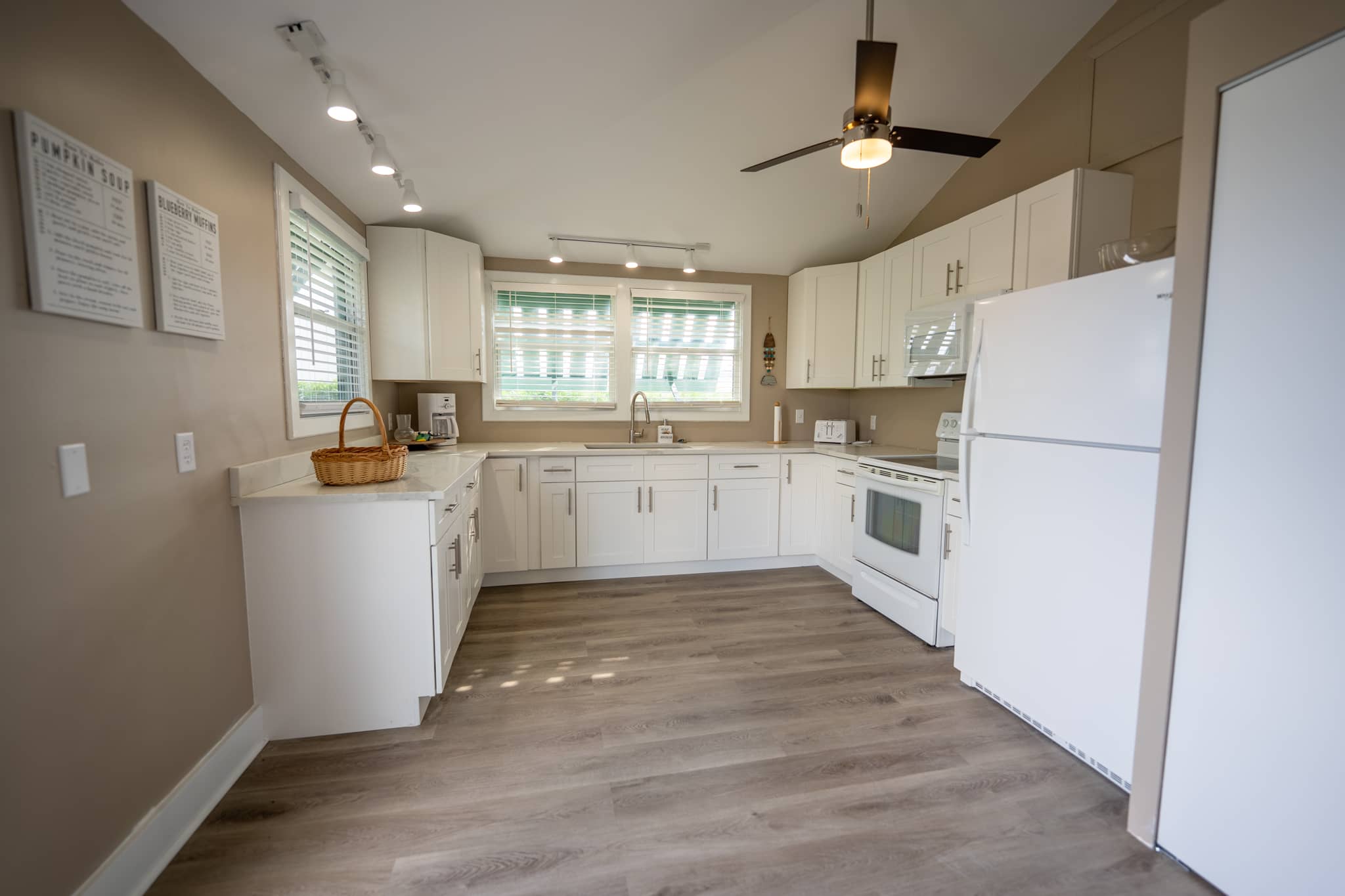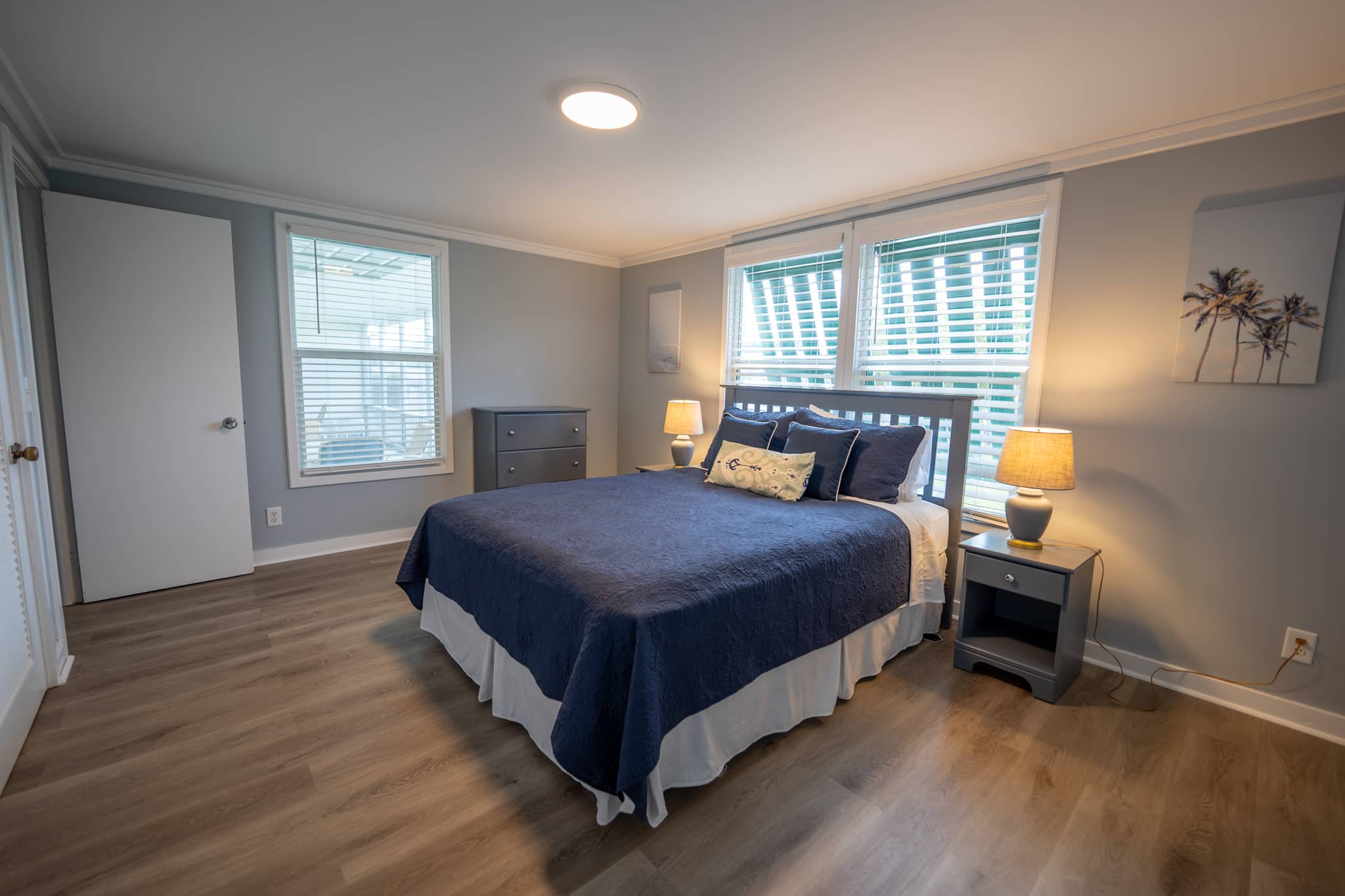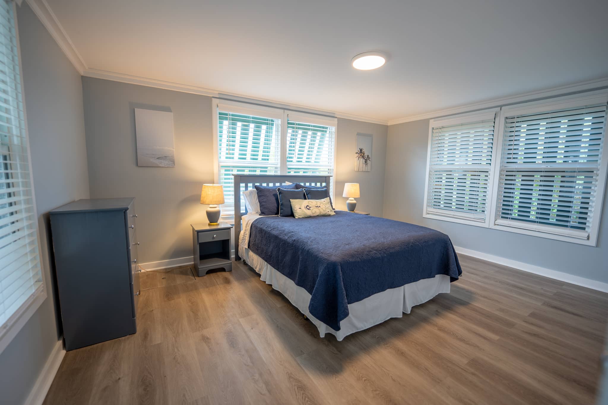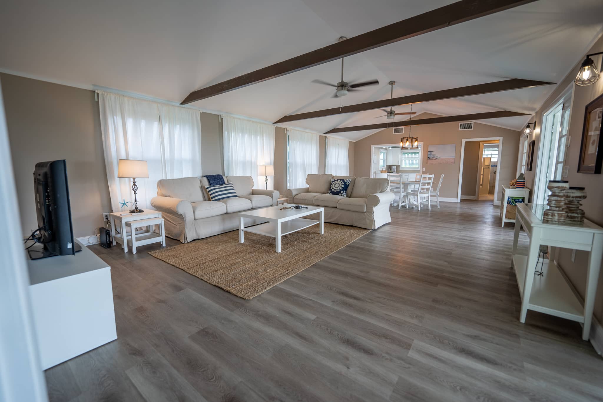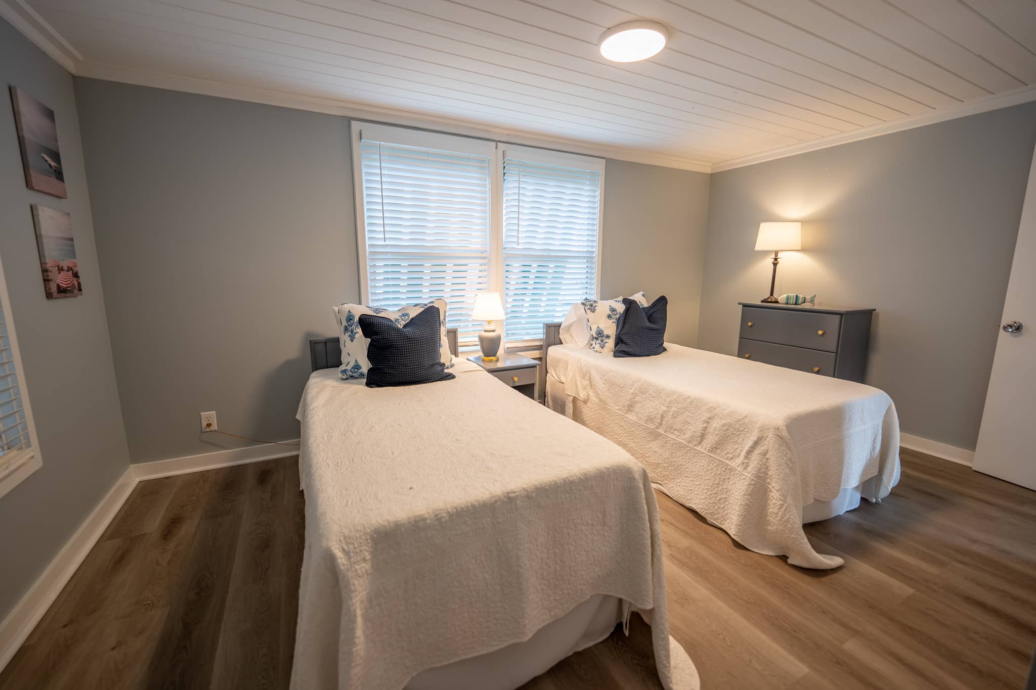 The cottage has been completely renovated with all new furniture, beds and appliances. The cottage has an open-plan kitchen, dining and living room with French doors that lead out onto the large screened-in porch. The kitchen has everything you need to cook at home, should you decide to. The living room has a flat-screen TV with cable television and wifi. The master bedroom has a king-size bed, the second bedroom has a queen-size bed and the third bedroom has 2 twin beds. There are two full bathrooms and a laundry room with a washer and dryer.