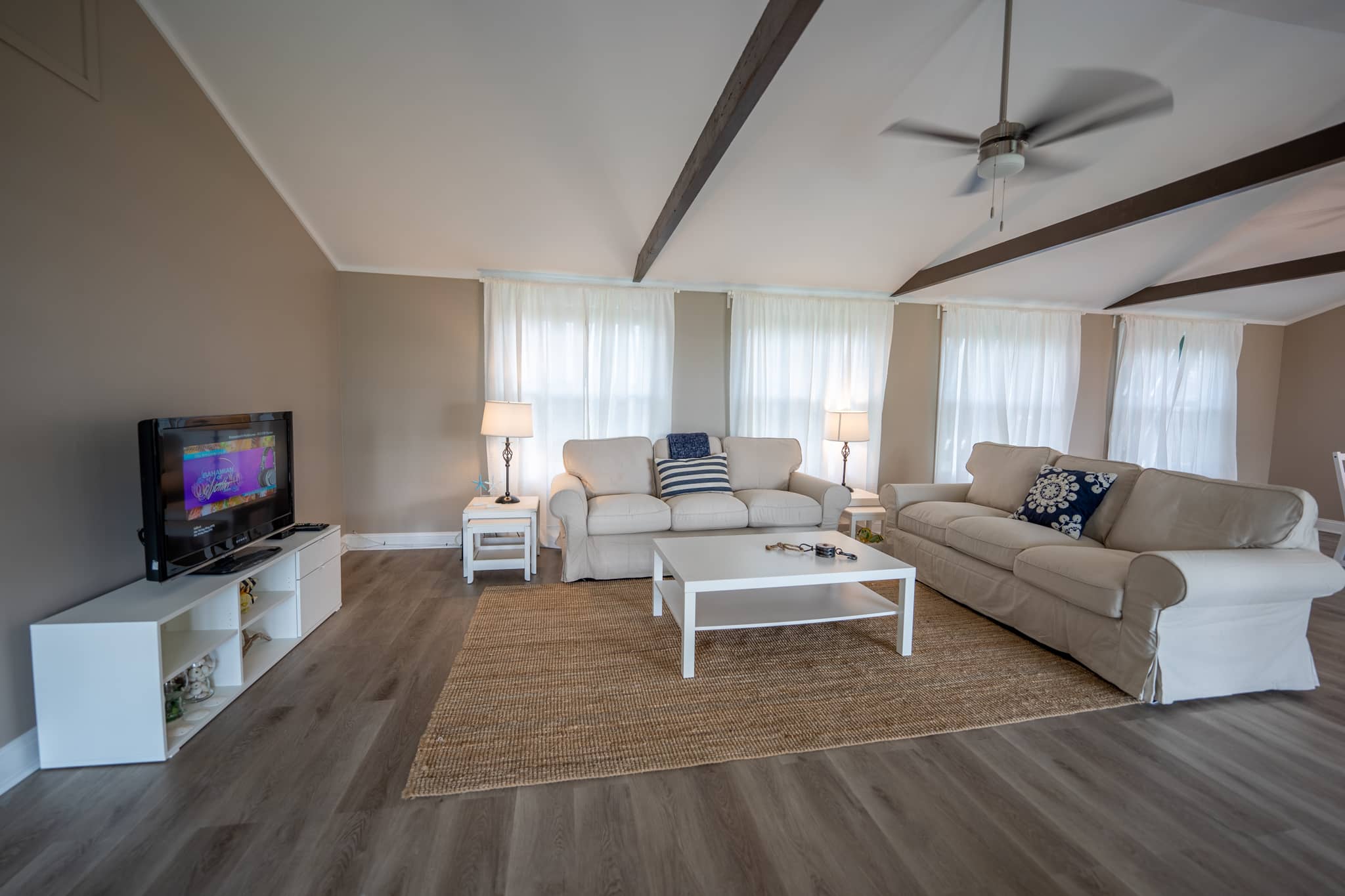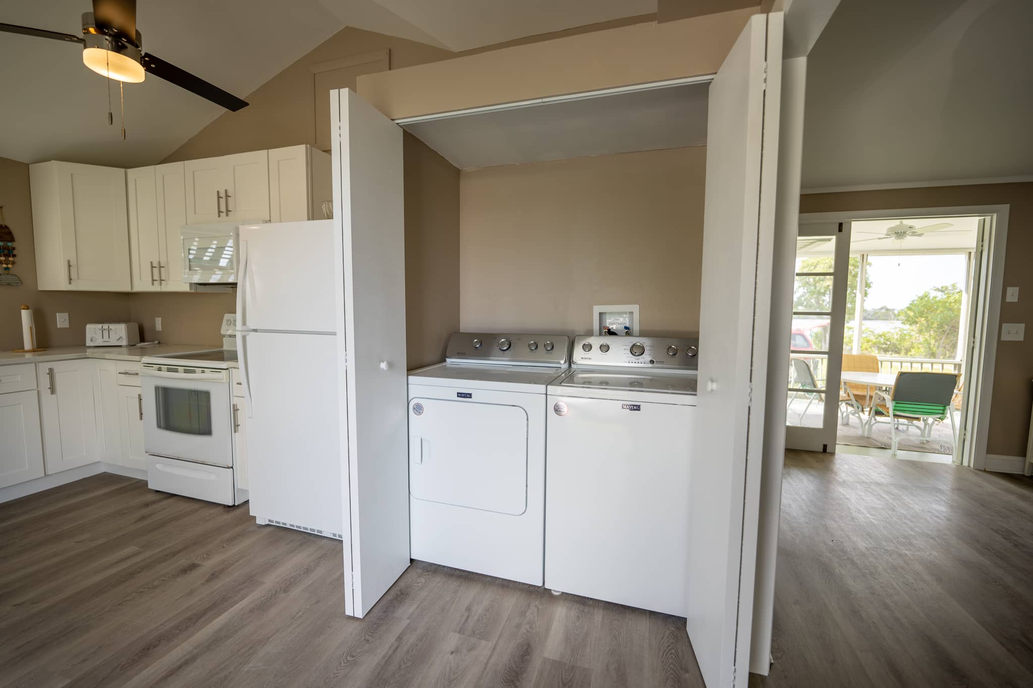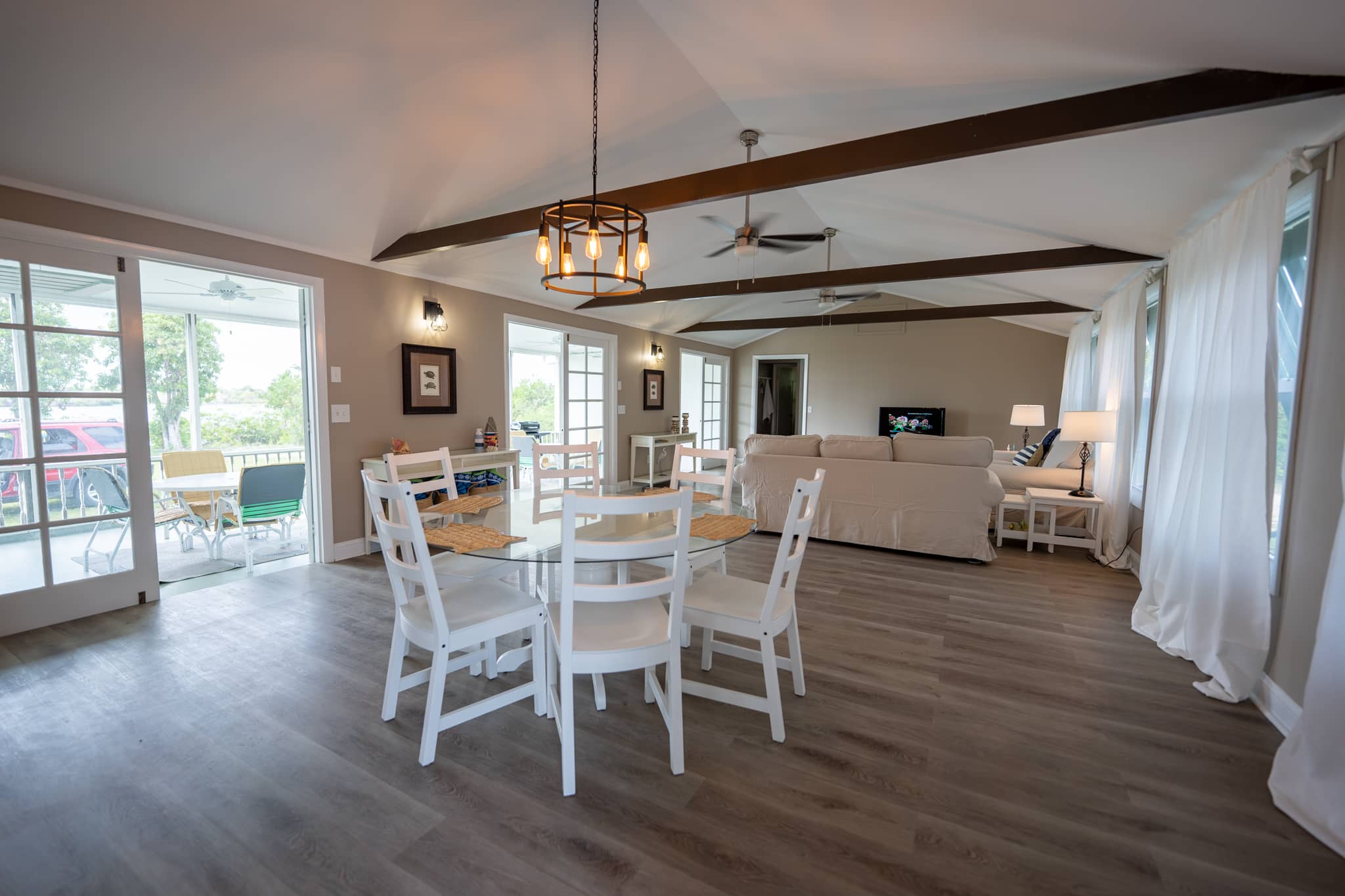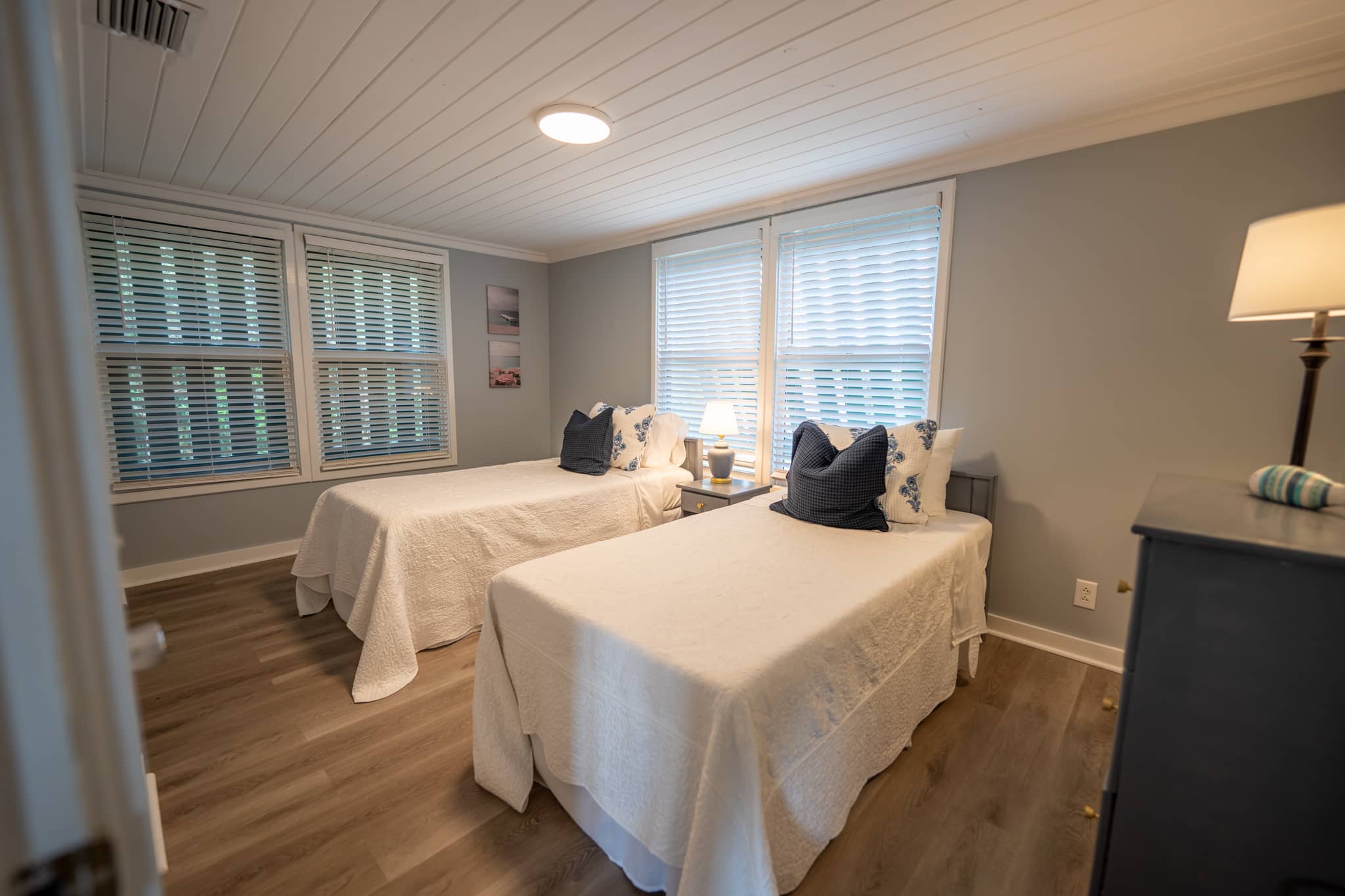 The cottage has been completely renovated with all new furniture, beds and appliances. The cottage has an open-plan kitchen, dining and living room with French doors that lead out onto the large screened-in porch. The kitchen has everything you need to cook at home, should you decide to. The living room has a flat-screen TV with cable television and wifi. The master bedroom has a king-size bed, the second bedroom has a queen-size bed and the third bedroom has 2 twin beds. There are two full bathrooms and a laundry room with a washer and dryer.