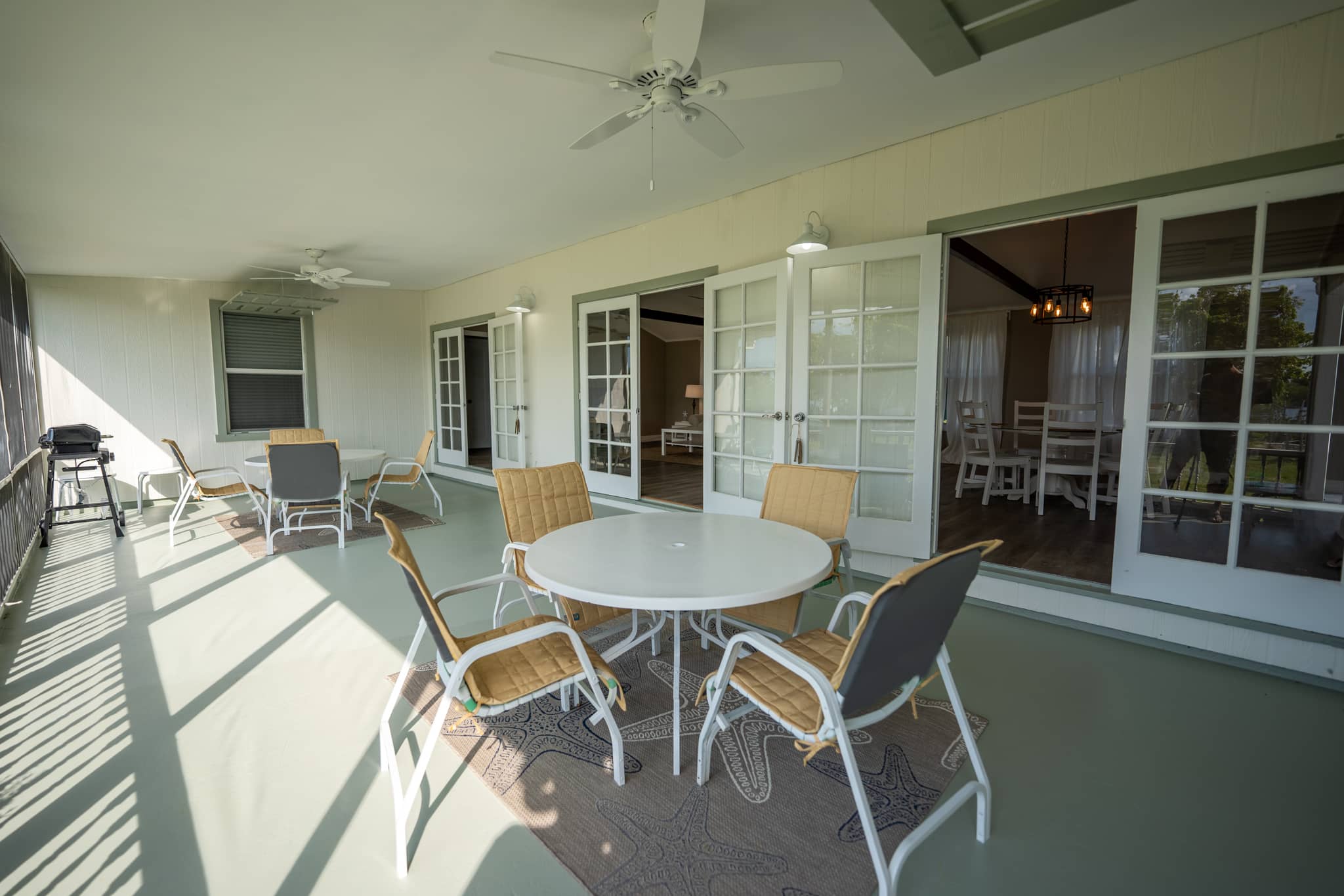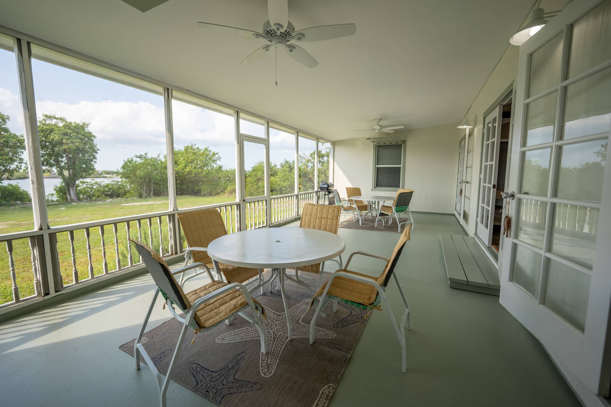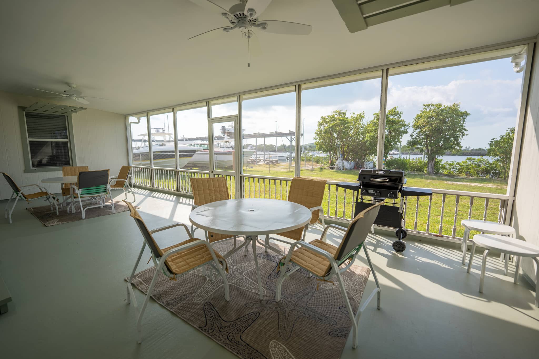 The large screened-in porch has two tables and chairs with a lot of seating for family and friends who can enjoy the sunsets, or while you grill your catch of the day.