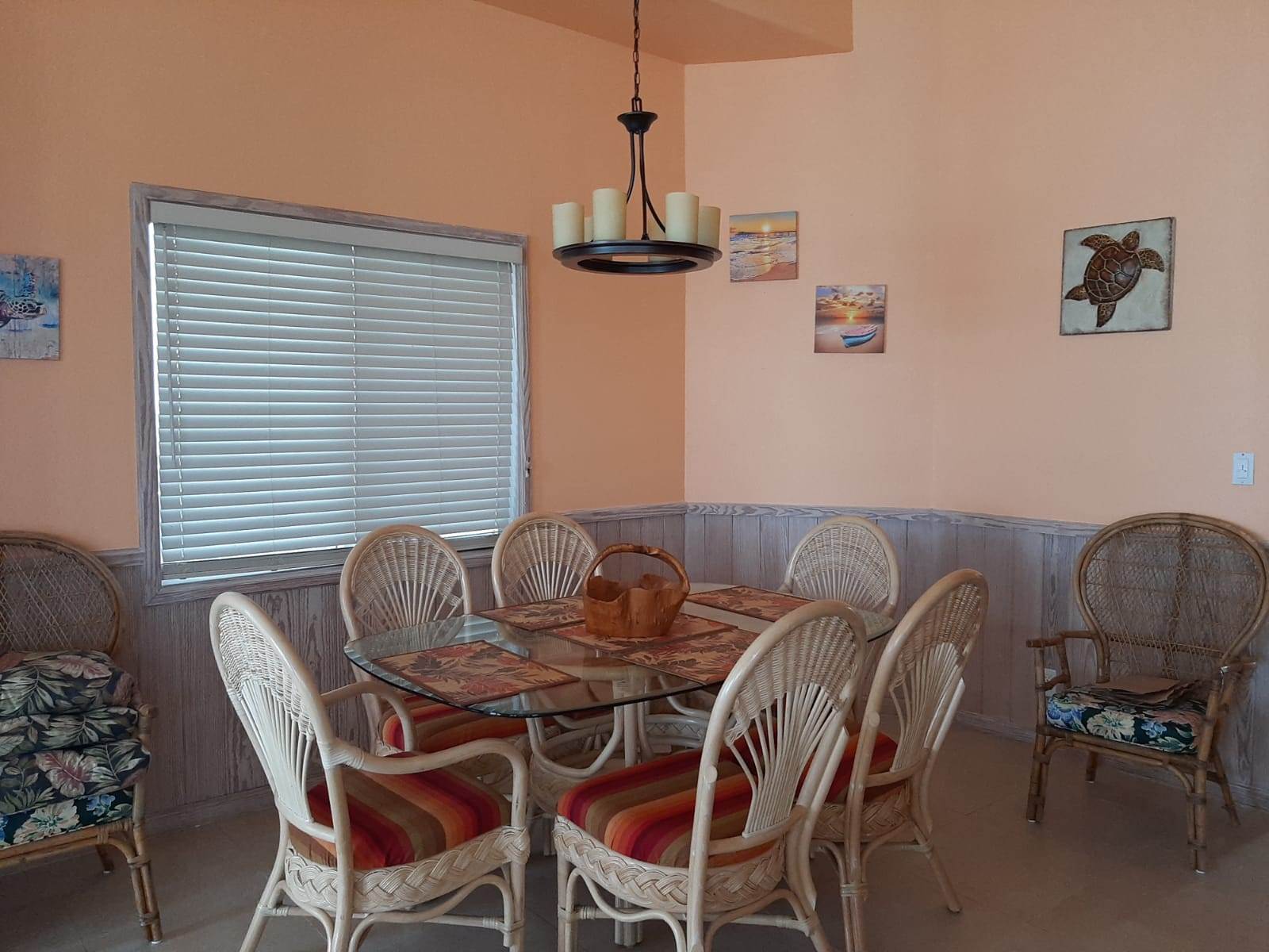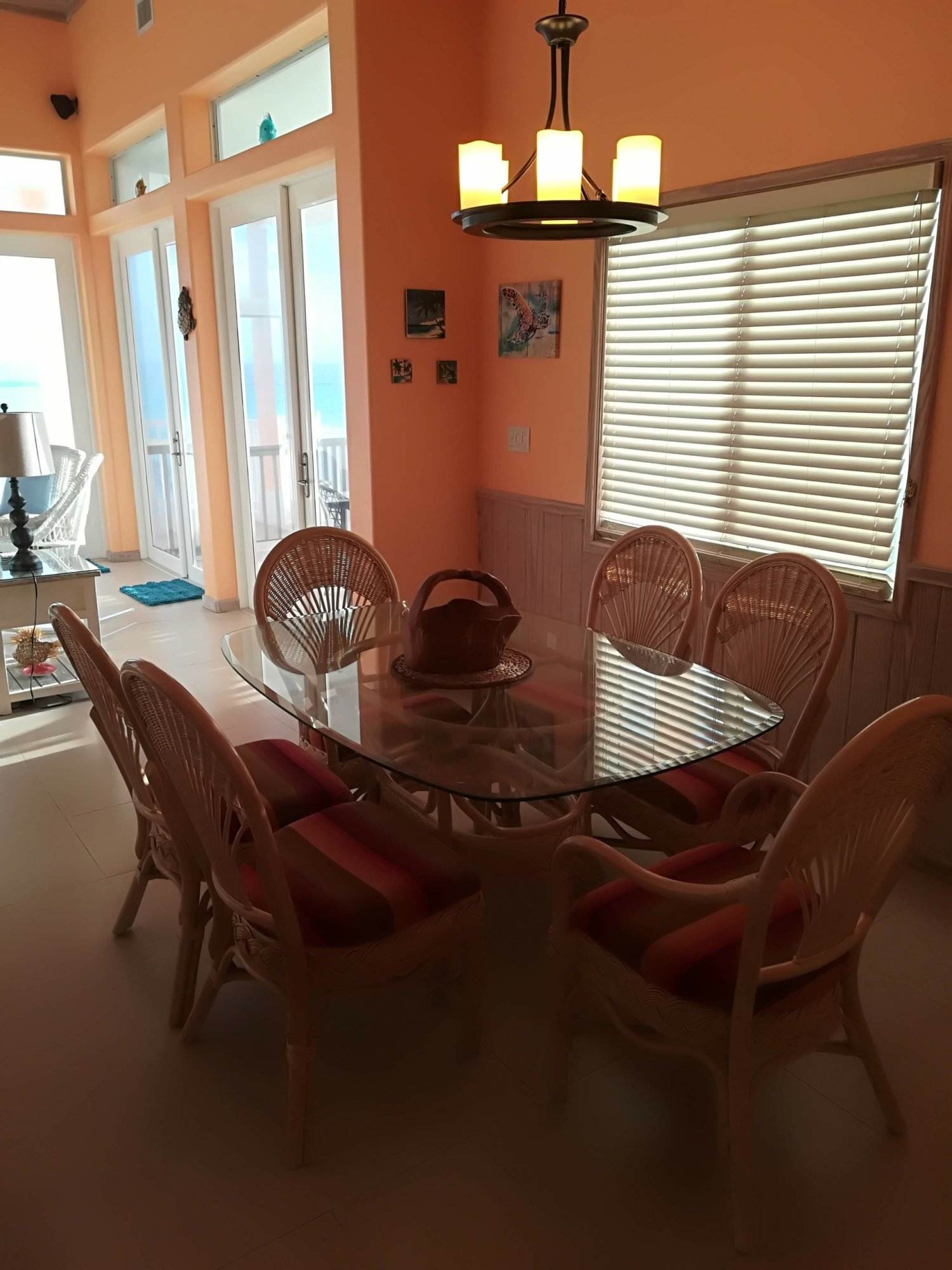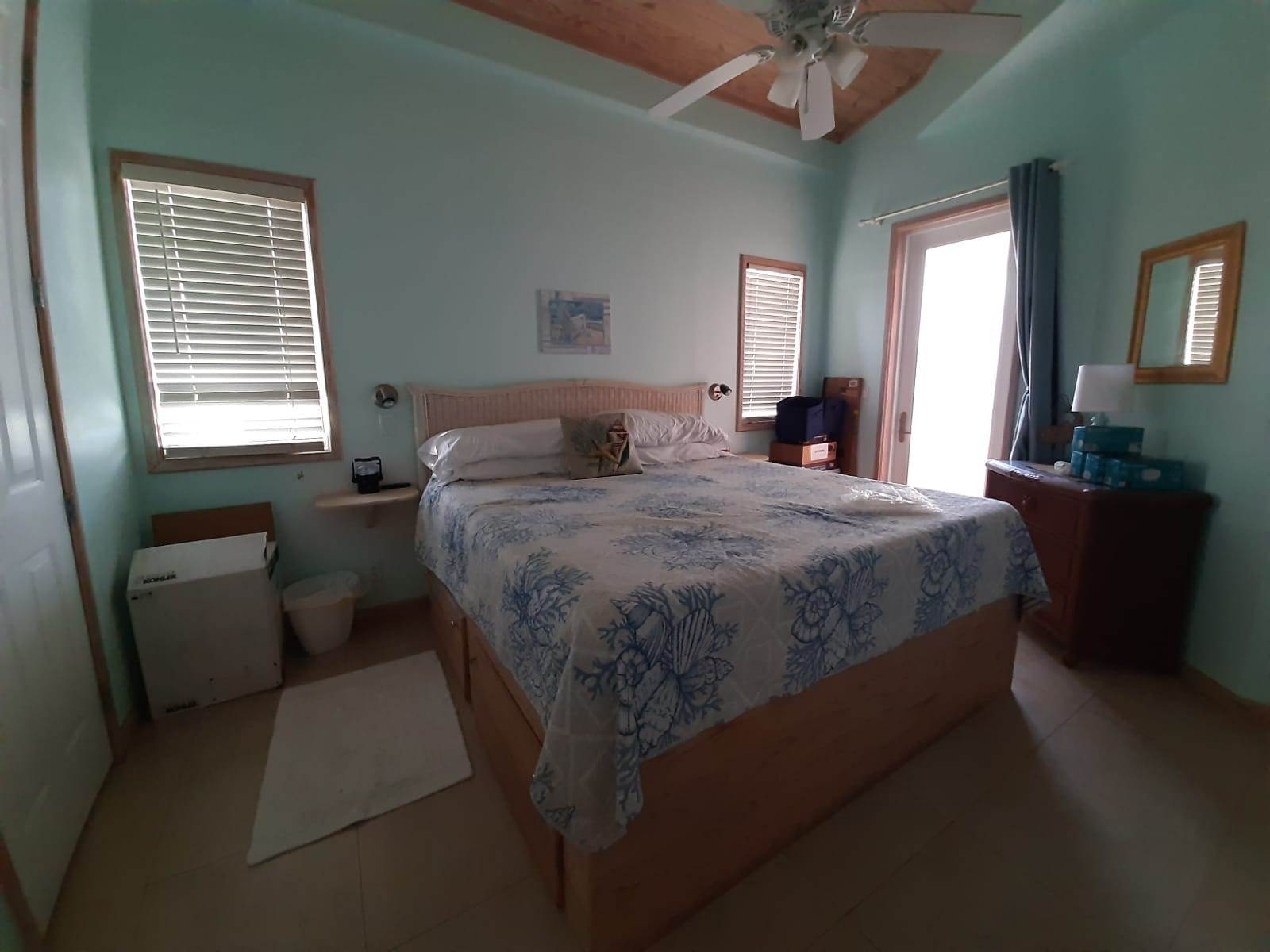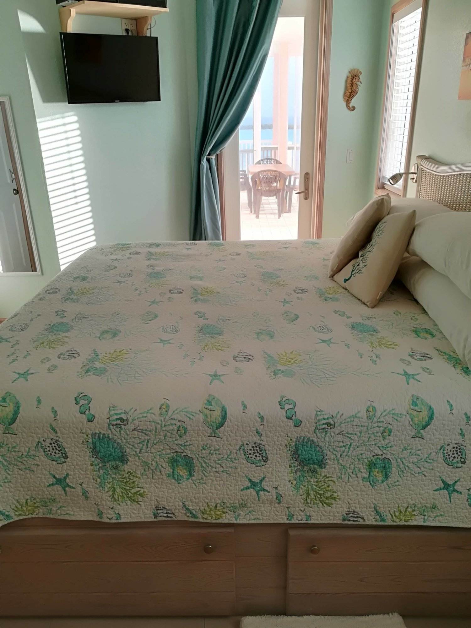The second master bedroom also has a king-size bed, a door leading out onto a screened-in porch and a door leading into a further bathroom with a walk-in shower. The third upstairs bedroom has 2 twin beds, which can be made up into a king bed. There is also an open plan kitchen/living/dining area with extraordinary views of Bita Bay beach. The kitchen has a microwave, dishwasher and large fridge/freezer. The dining room table can seat 6, while the bar can seat 3 on barstools. There is also a large table and chairs on the screened-in porch, should you decide to dine outside. The living room offers a large flat-screen TV with satellite, a DVD player as well as ample books and games. The home has AC throughout, a washer and dryer, VHF radio and WiFi.