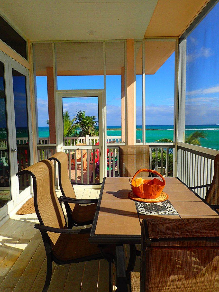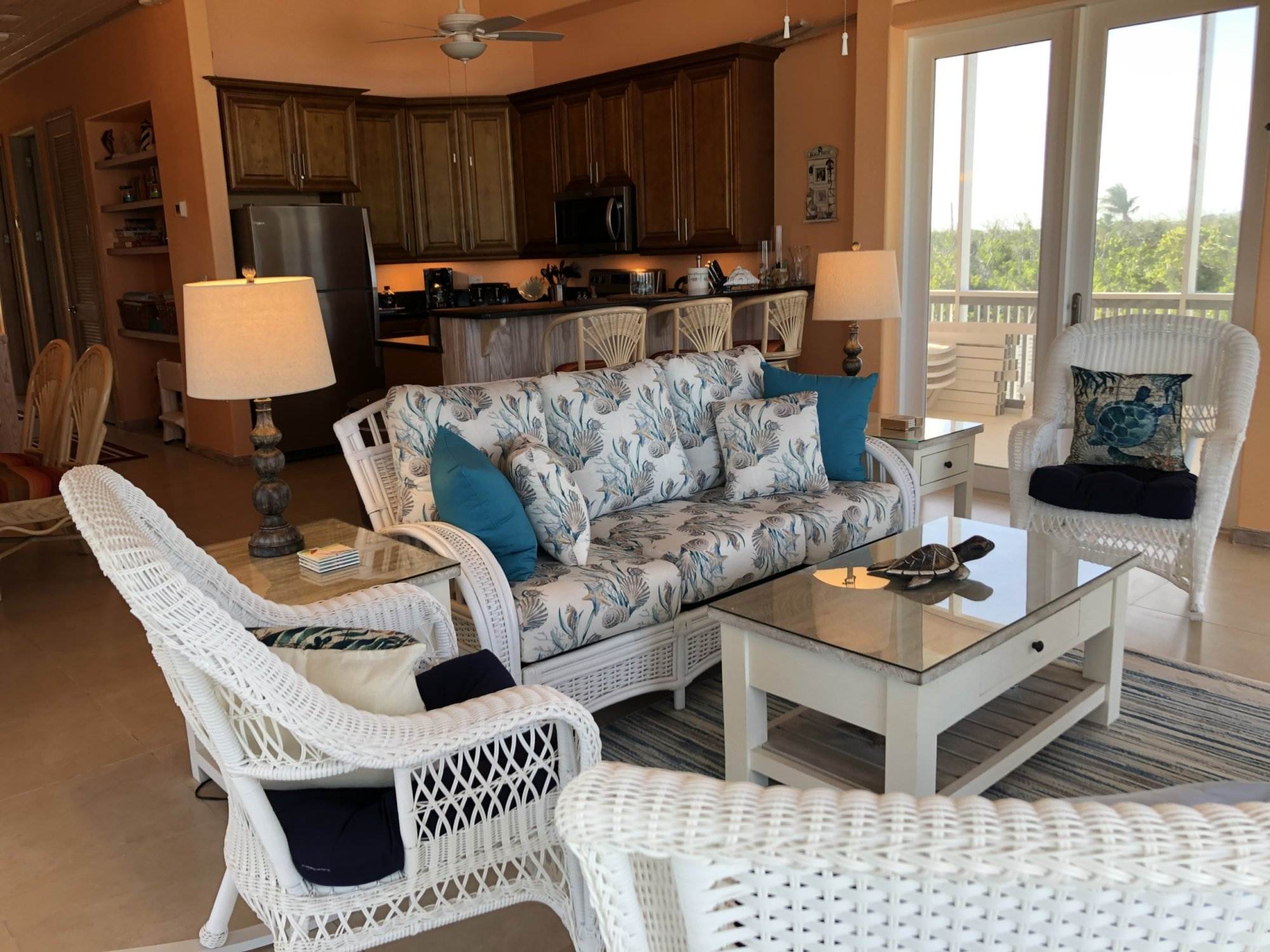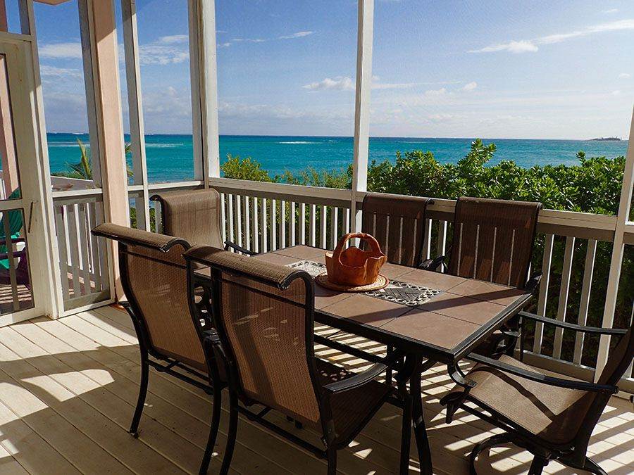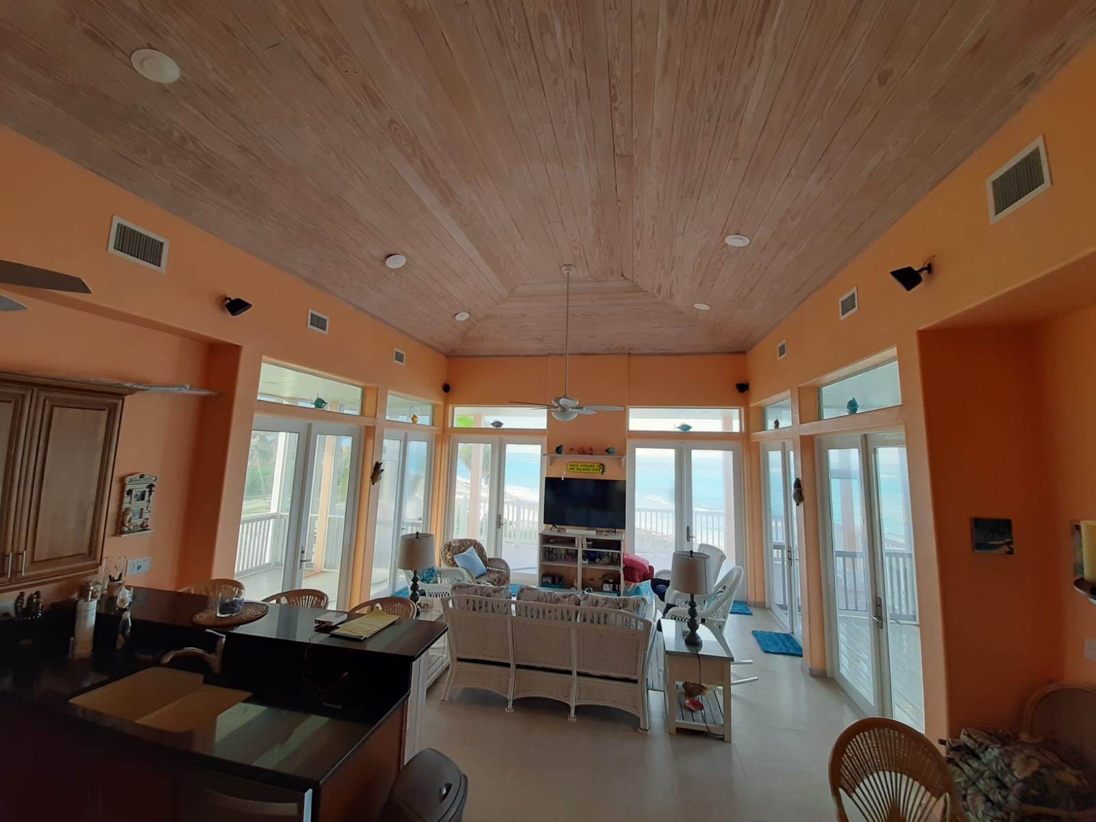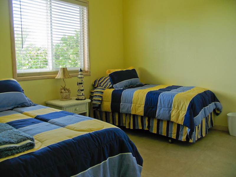 The second master bedroom also has a king-size bed, a door leading out onto a screened-in porch and a door leading into a further bathroom with a walk-in shower. The third upstairs bedroom has 2 twin beds, which can be made up into a king bed. There is also an open plan kitchen/living/dining area with extraordinary views of Bita Bay beach. The kitchen has a microwave, dishwasher and large fridge/freezer. The dining room table can seat 6, while the bar can seat 3 on barstools. There is also a large table and chairs on the screened-in porch, should you decide to dine outside. The living room offers a large flat-screen TV with satellite, a DVD player as well as ample books and games. The home has AC throughout, a washer and dryer, VHF radio and WiFi.