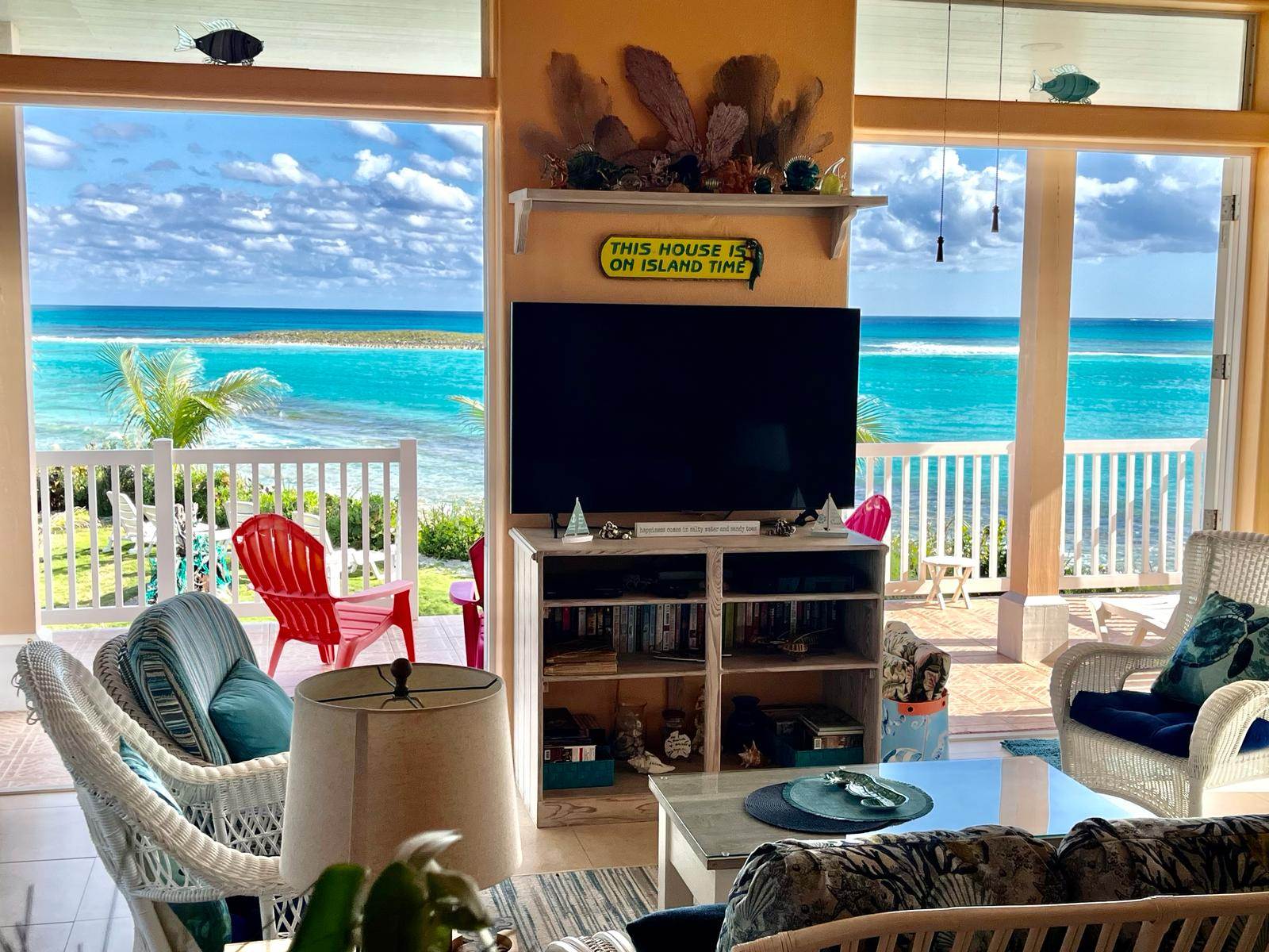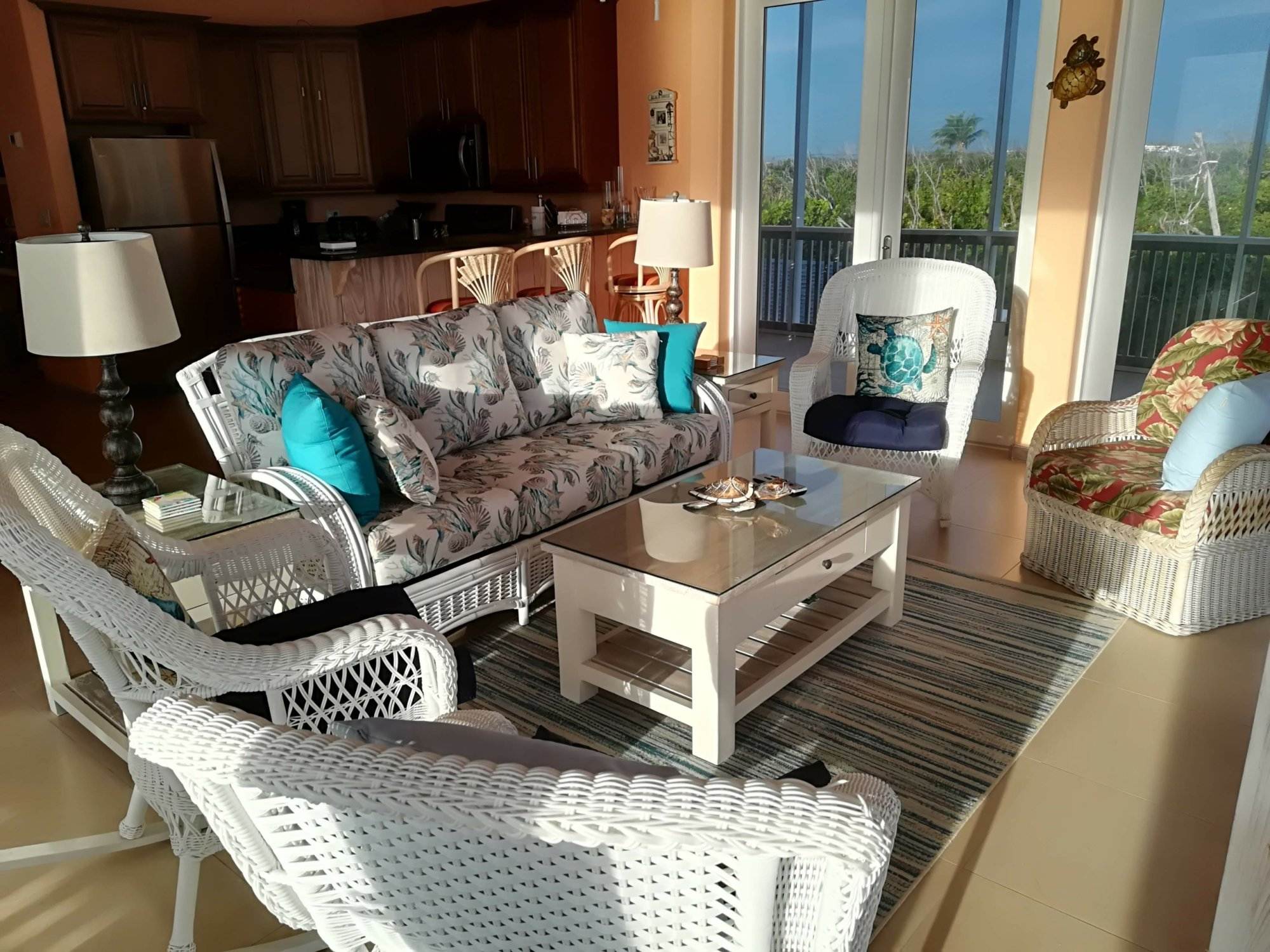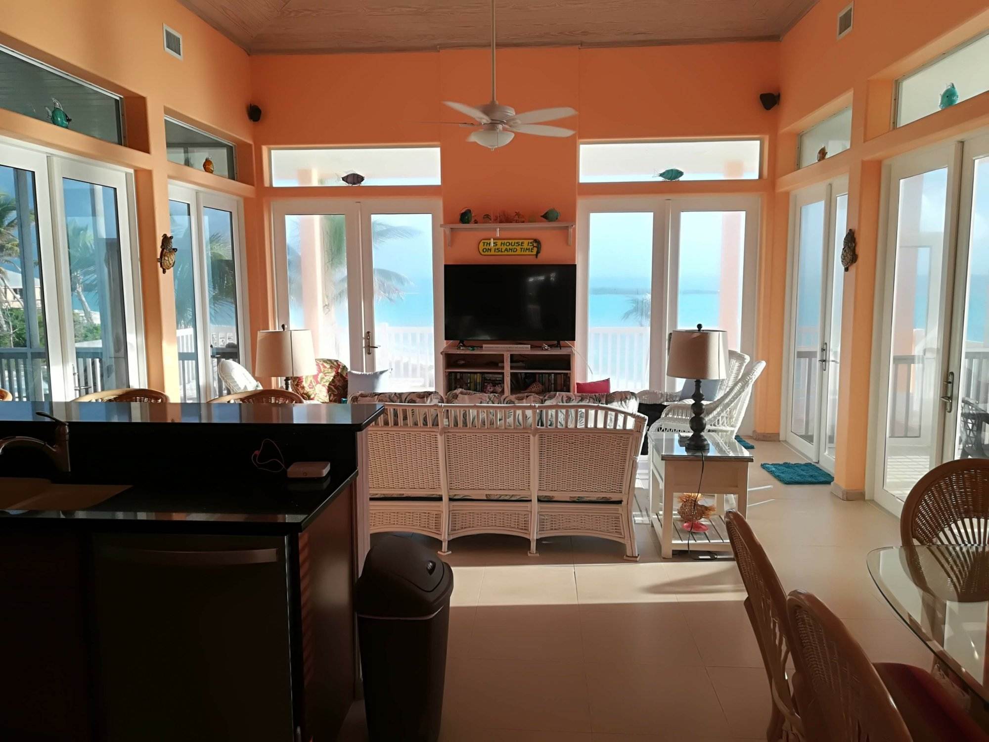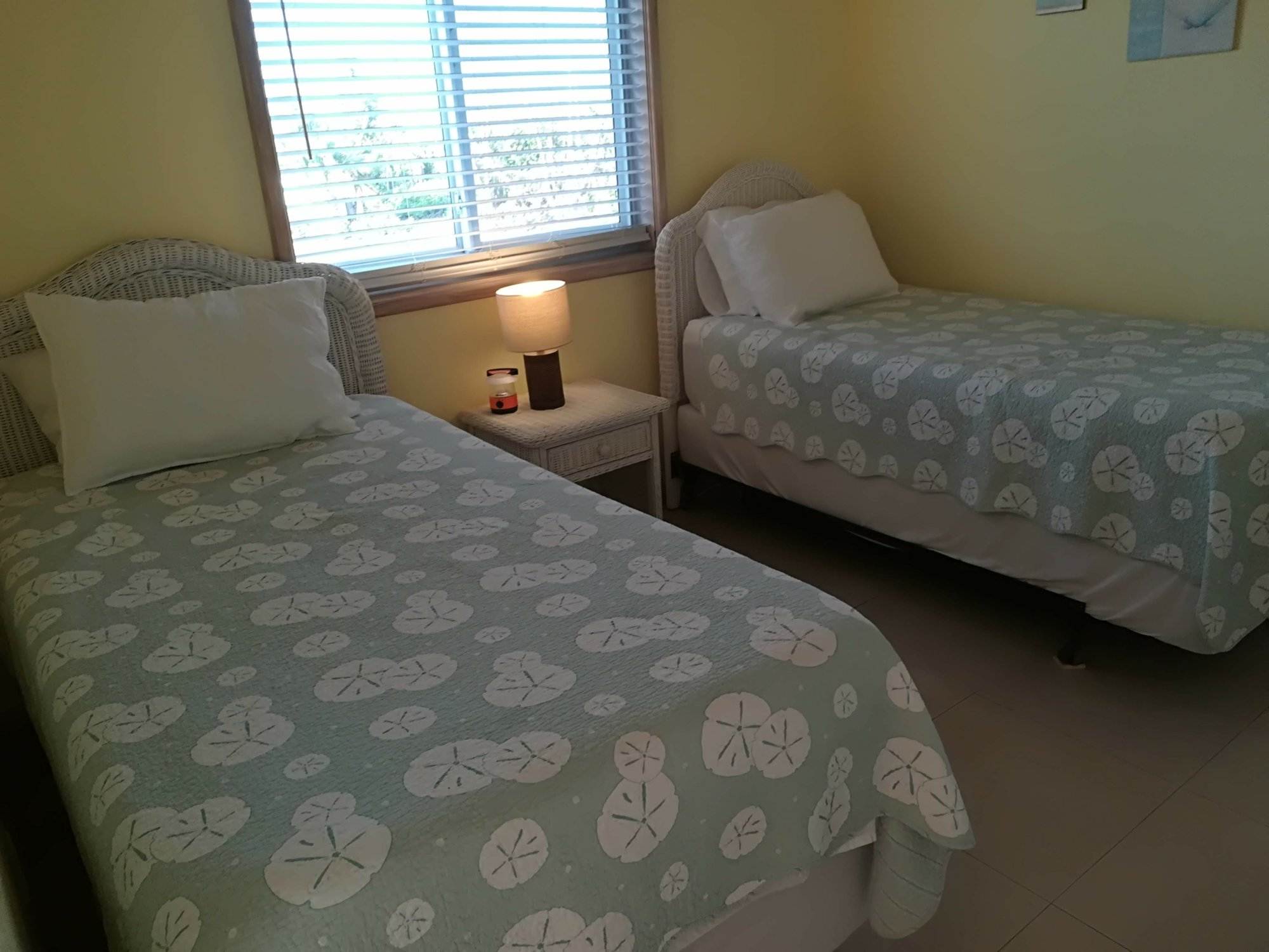 The second master bedroom also has a king-size bed, a door leading out onto a screened-in porch and a door leading into a further bathroom with a walk-in shower. The third upstairs bedroom has 2 twin beds, which can be made up into a king bed. There is also an open plan kitchen/living/dining area with extraordinary views of Bita Bay beach. The kitchen has a microwave, dishwasher and large fridge/freezer. The dining room table can seat 6, while the bar can seat 3 on barstools. There is also a large table and chairs on the screened-in porch, should you decide to dine outside. The living room offers a large flat-screen TV with satellite, a DVD player as well as ample books and games. The home has AC throughout, a washer and dryer, VHF radio and WiFi.