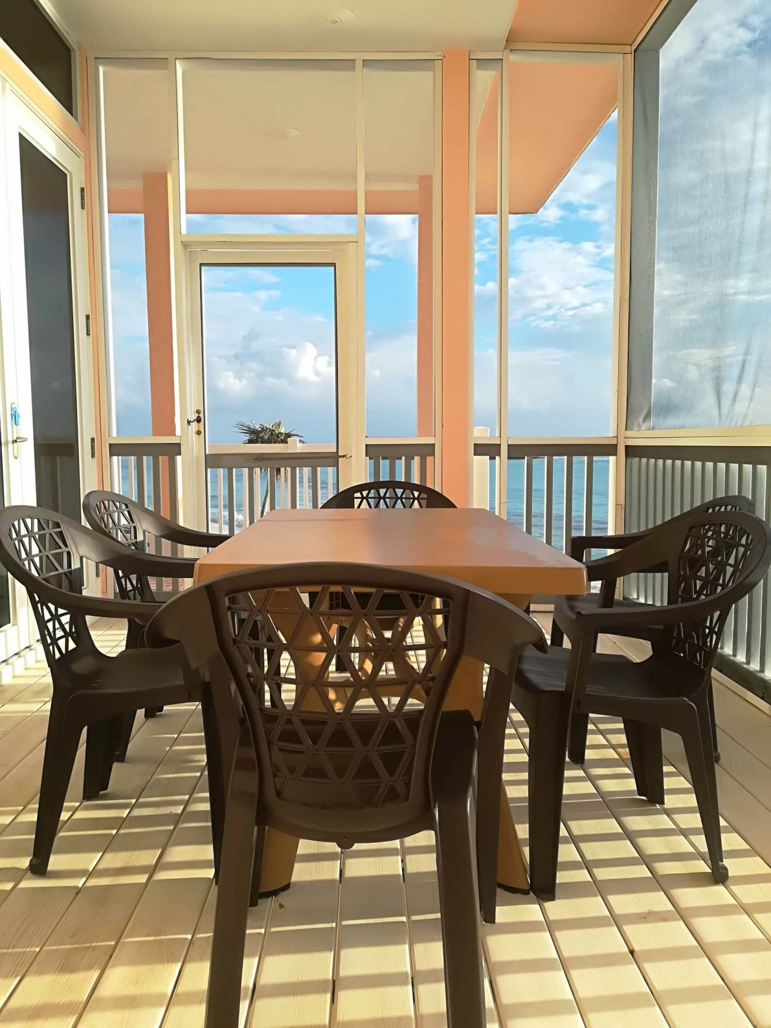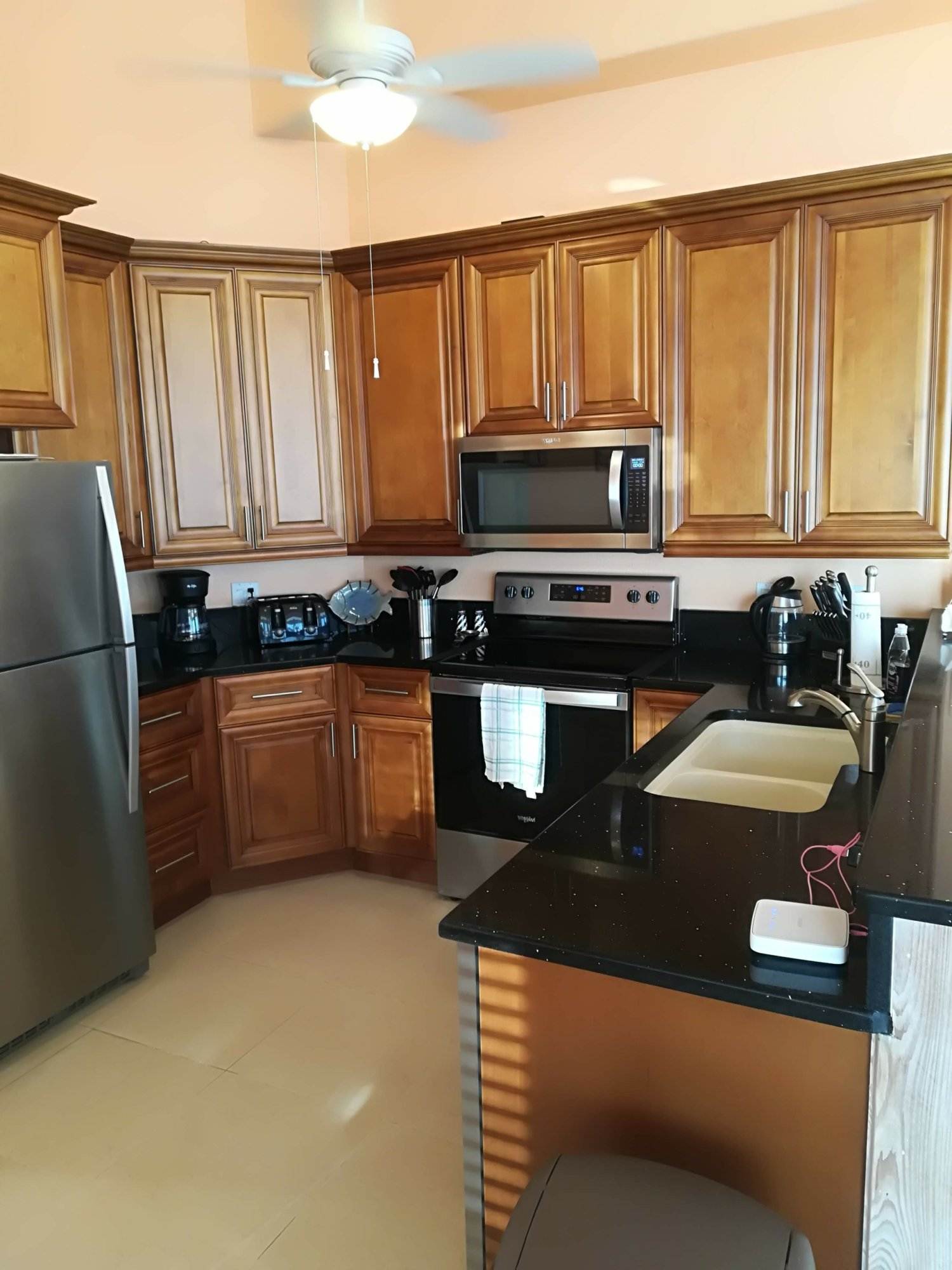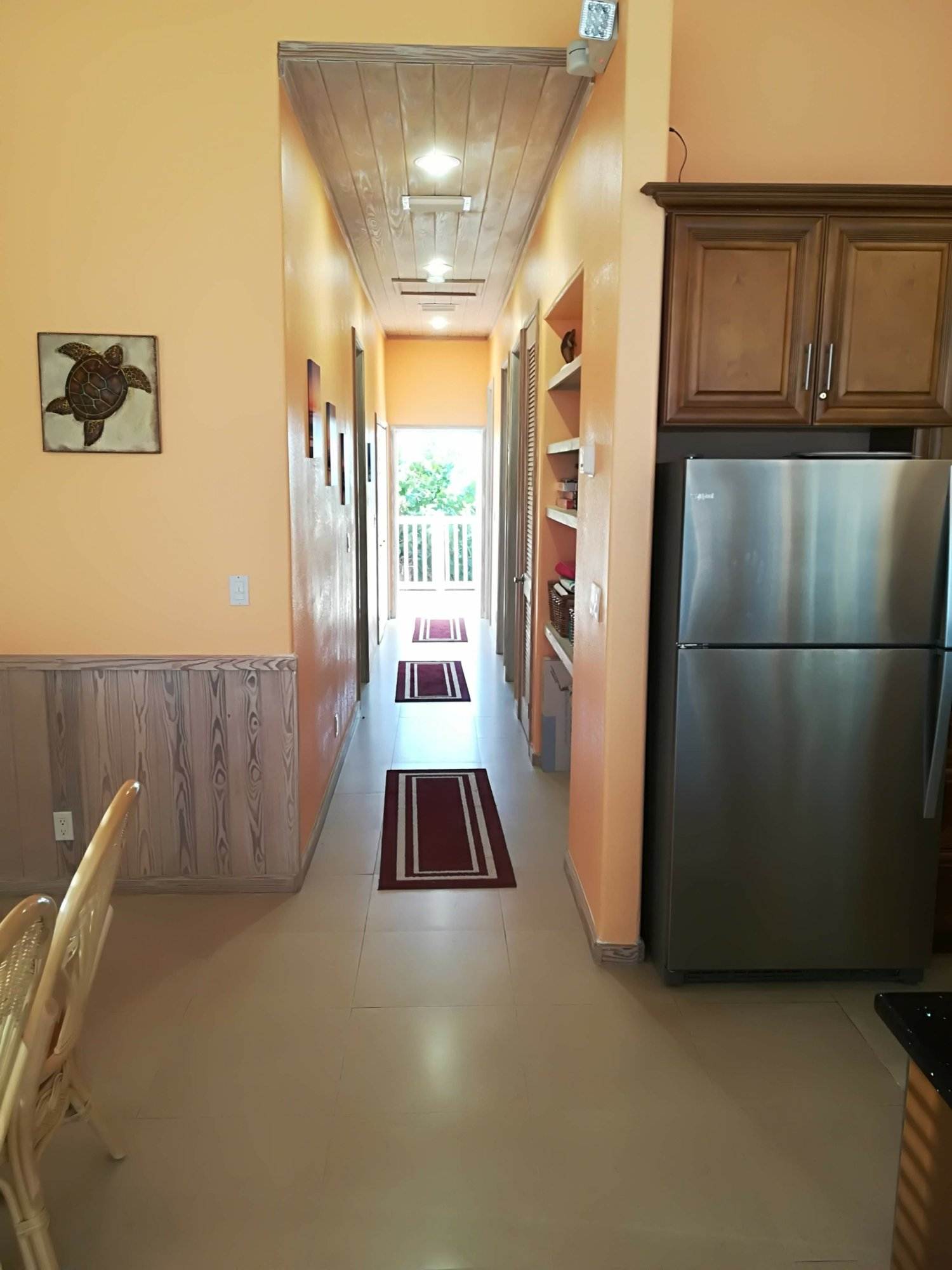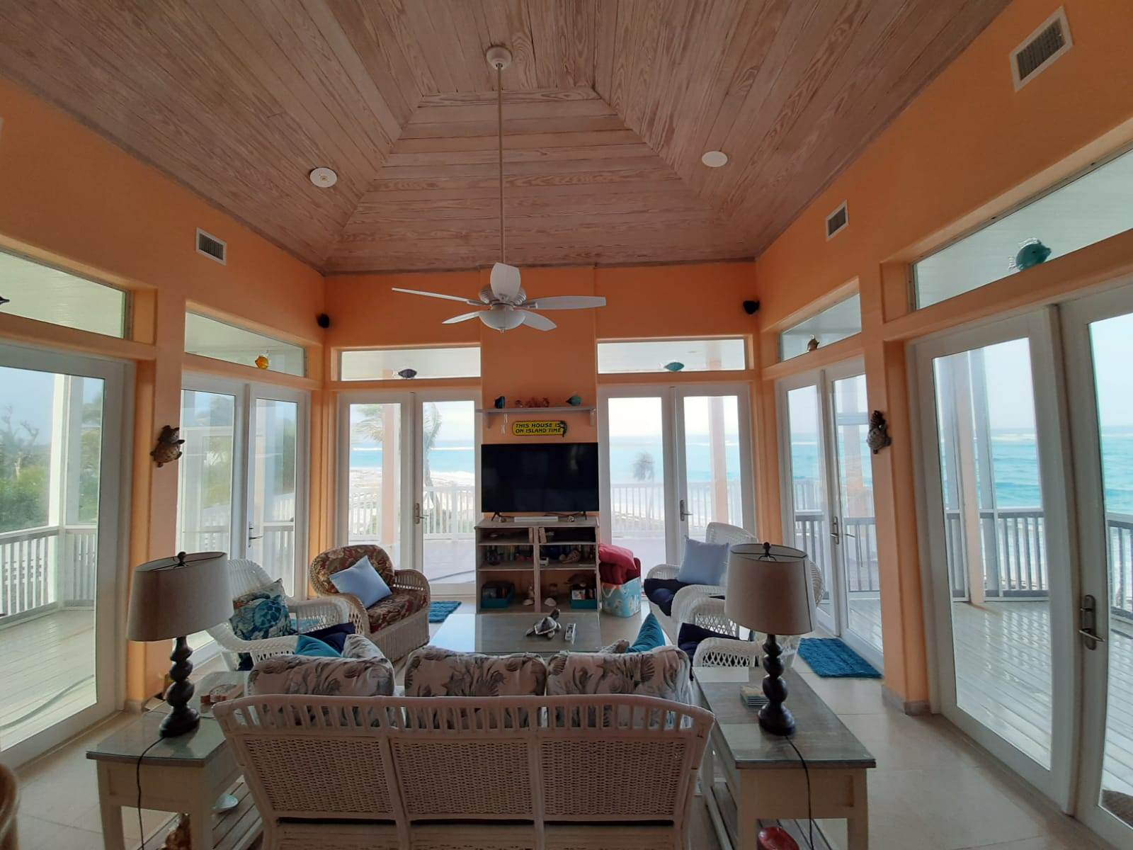 The second master bedroom also has a king-size bed, a door leading out onto a screened-in porch and a door leading into a further bathroom with a walk-in shower. The third upstairs bedroom has 2 twin beds, which can be made up into a king bed. There is also an open plan kitchen/living/dining area with extraordinary views of Bita Bay beach. The kitchen has a microwave, dishwasher and large fridge/freezer. The dining room table can seat 6, while the bar can seat 3 on barstools. There is also a large table and chairs on the screened-in porch, should you decide to dine outside. The living room offers a large flat-screen TV with satellite, a DVD player as well as ample books and games. The home has AC throughout, a washer and dryer, VHF radio and WiFi.