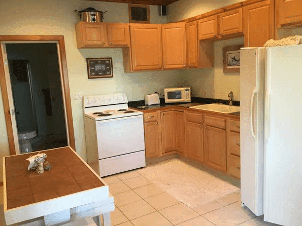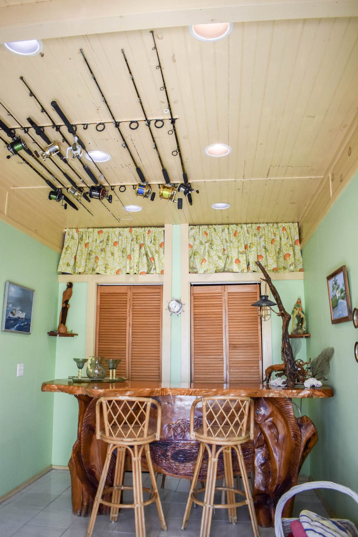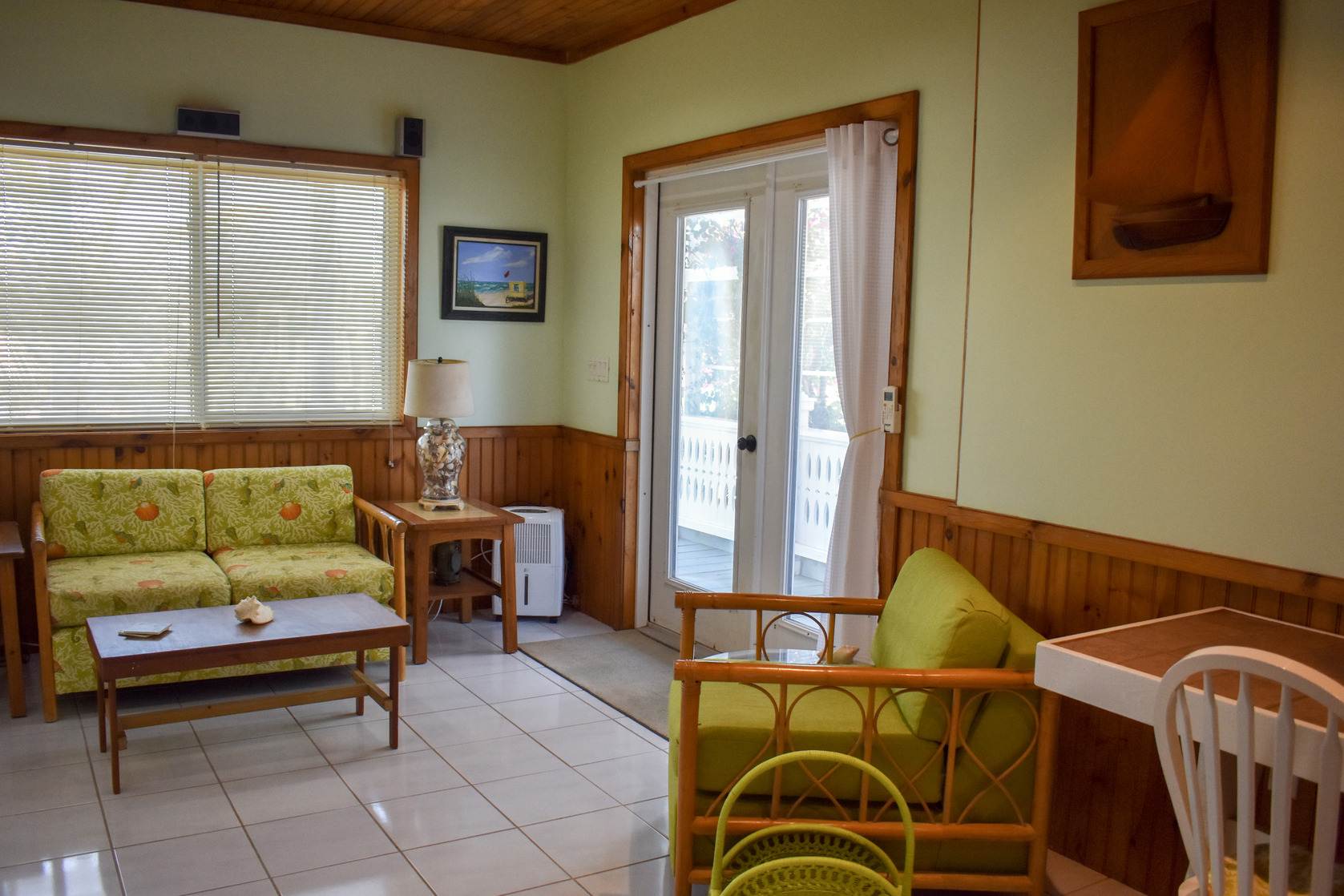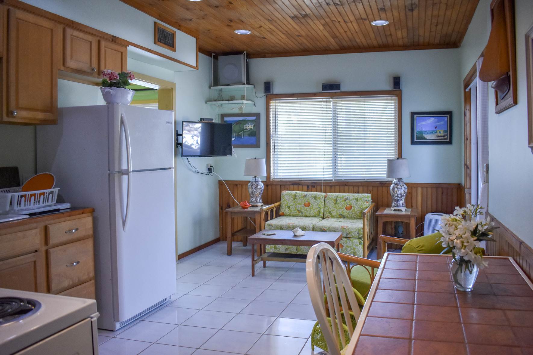 Located on the lower level of Dog House is a full apartment with an open design fully equipped kitchen, dining and living room. There is also an additional bedroom with twin beds and a bathroom with a shower. French doors open to a private covered patio directly on the water and a storage room with a washing machine.