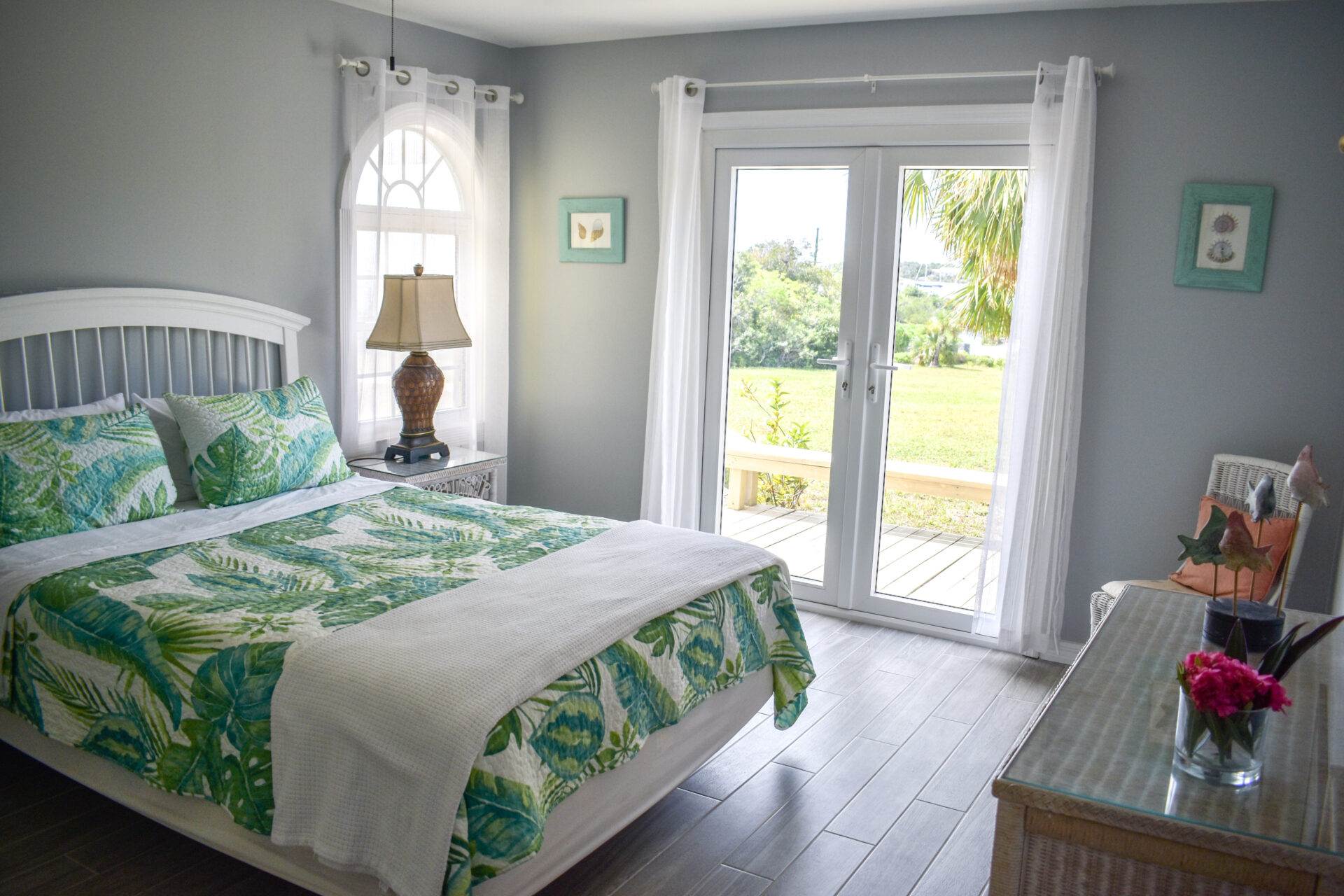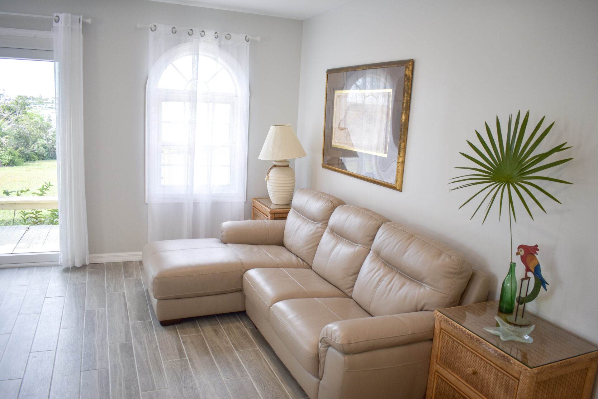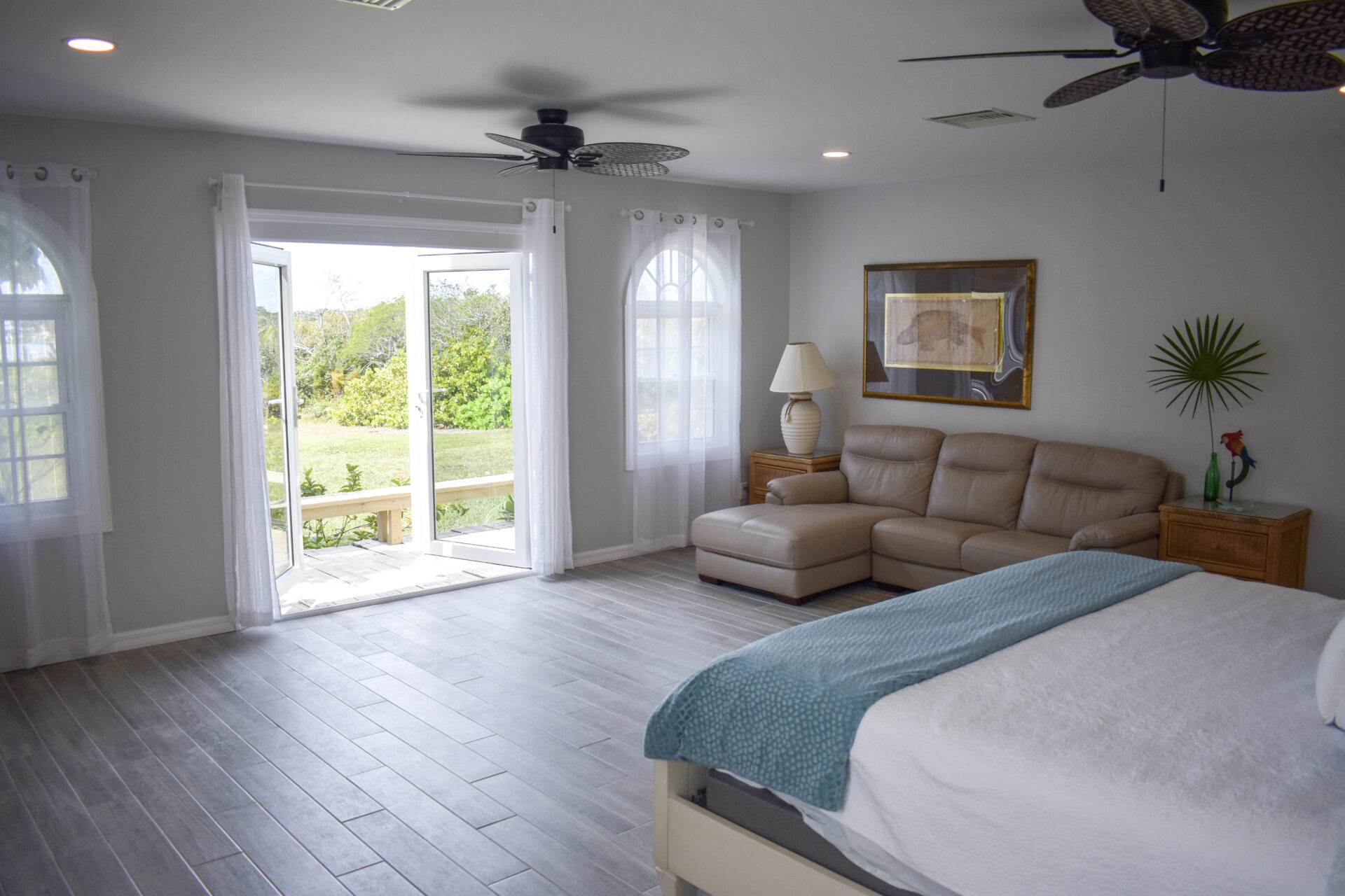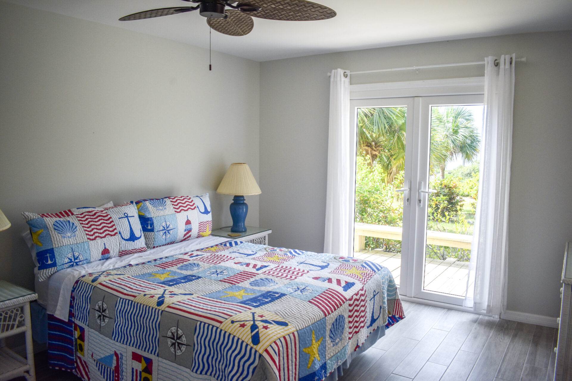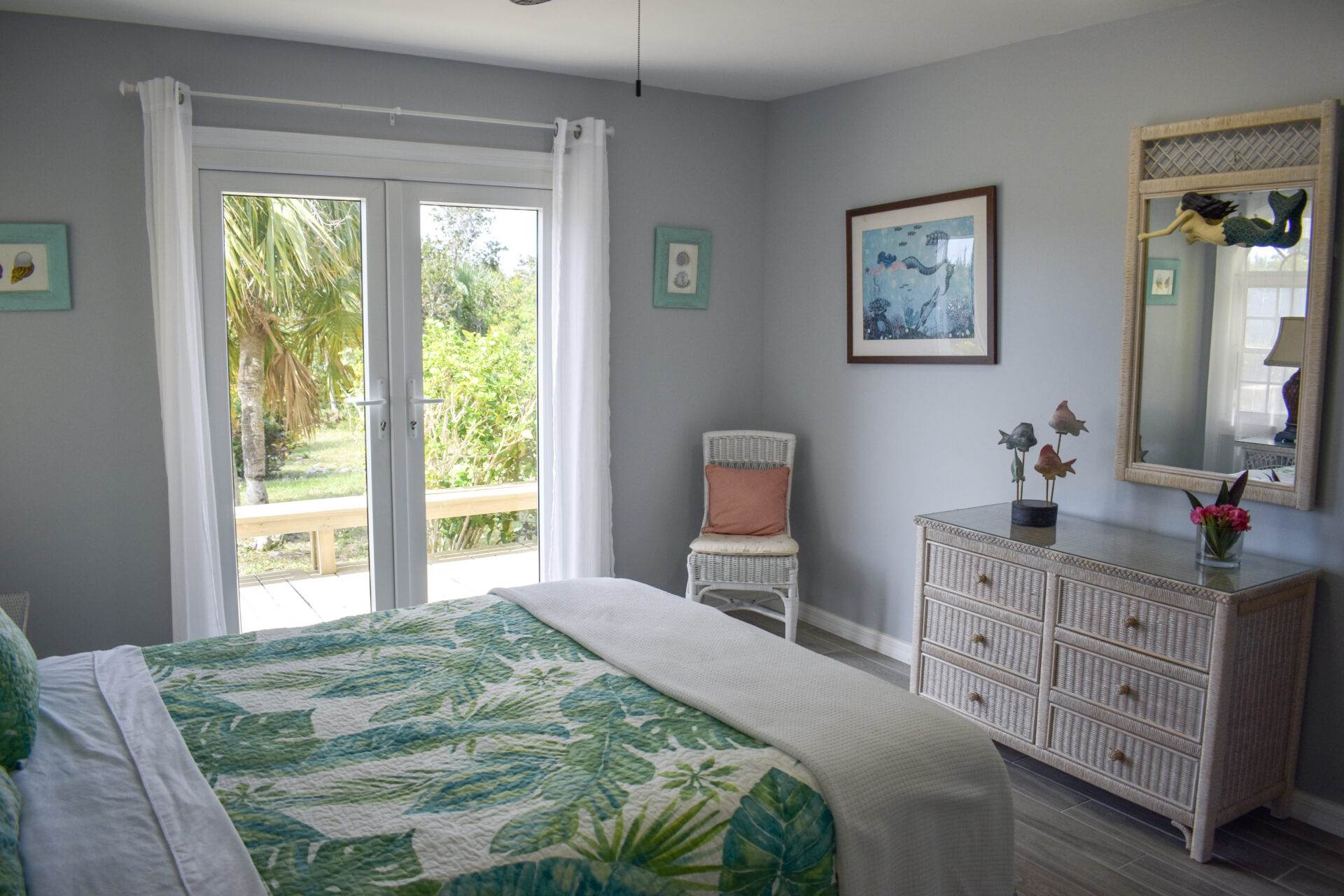 The heart of Oleander is the expansive, open-plan kitchen, dining, and living area, designed for social flow and bathed in natural light. Three matching sets of French doors line this space, leading directly out onto the deck, where the stunning views of White Sound Harbour take center stage. The kitchen is fully equipped with every essential, including a full-size stove, large fridge/freezer, dishwasher, and microwave. The living room provides two large, comfortable sofas for relaxing while enjoying the views or the large television.