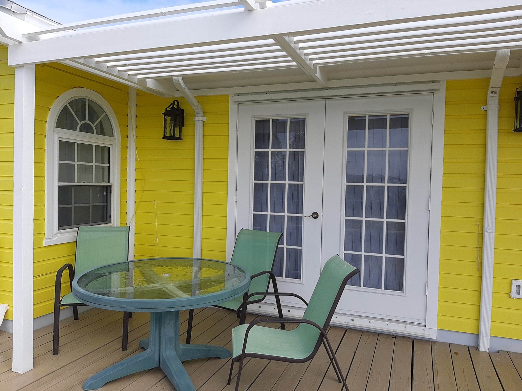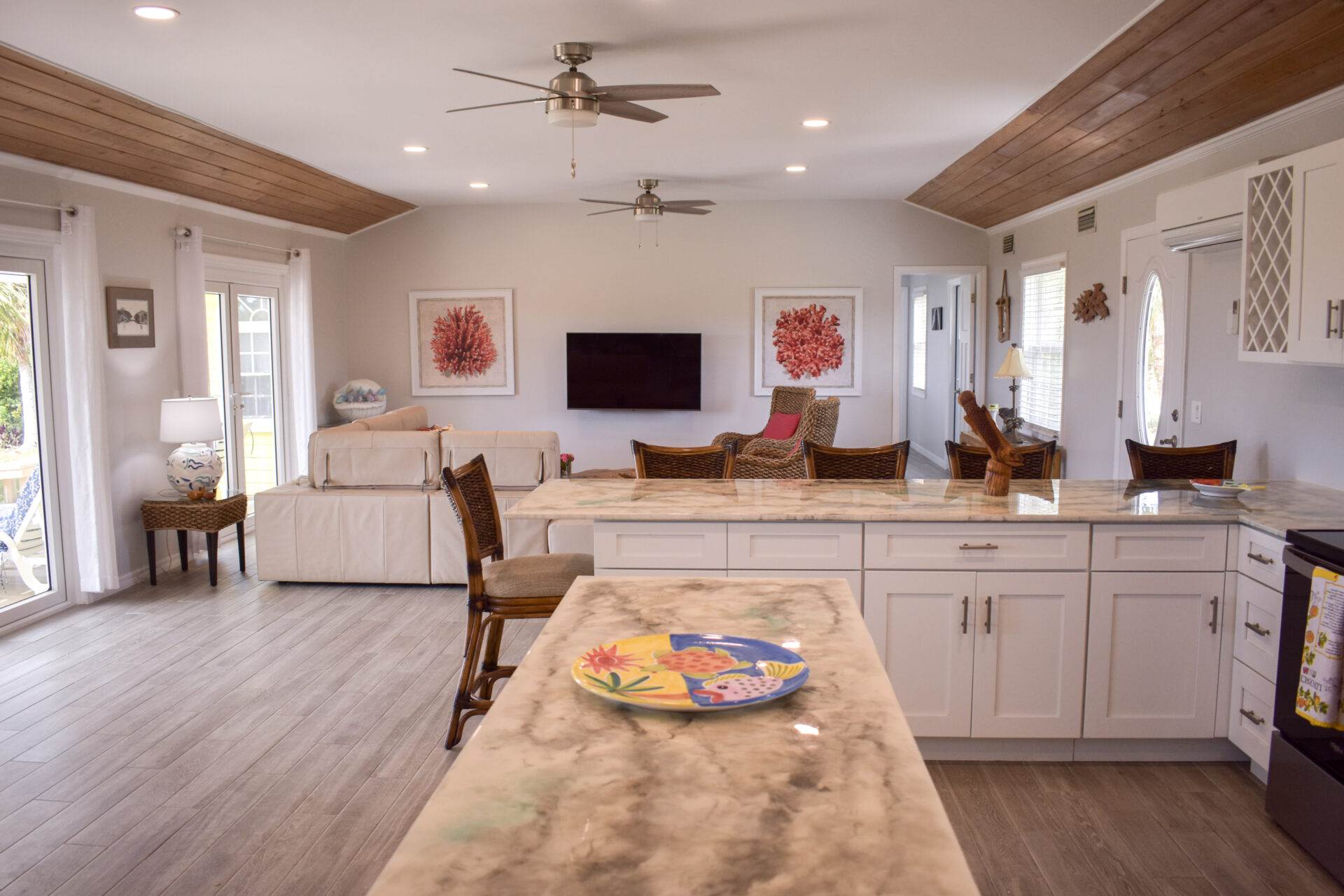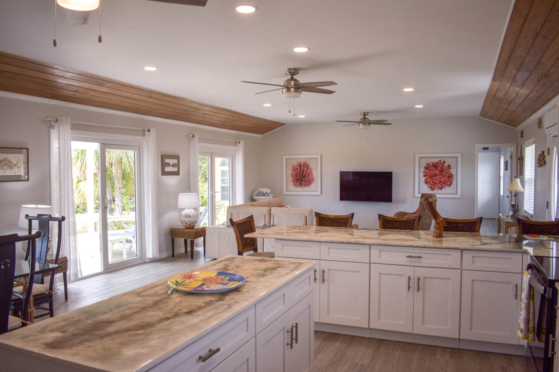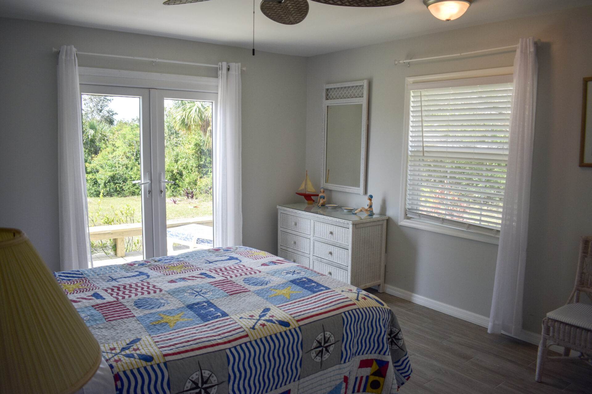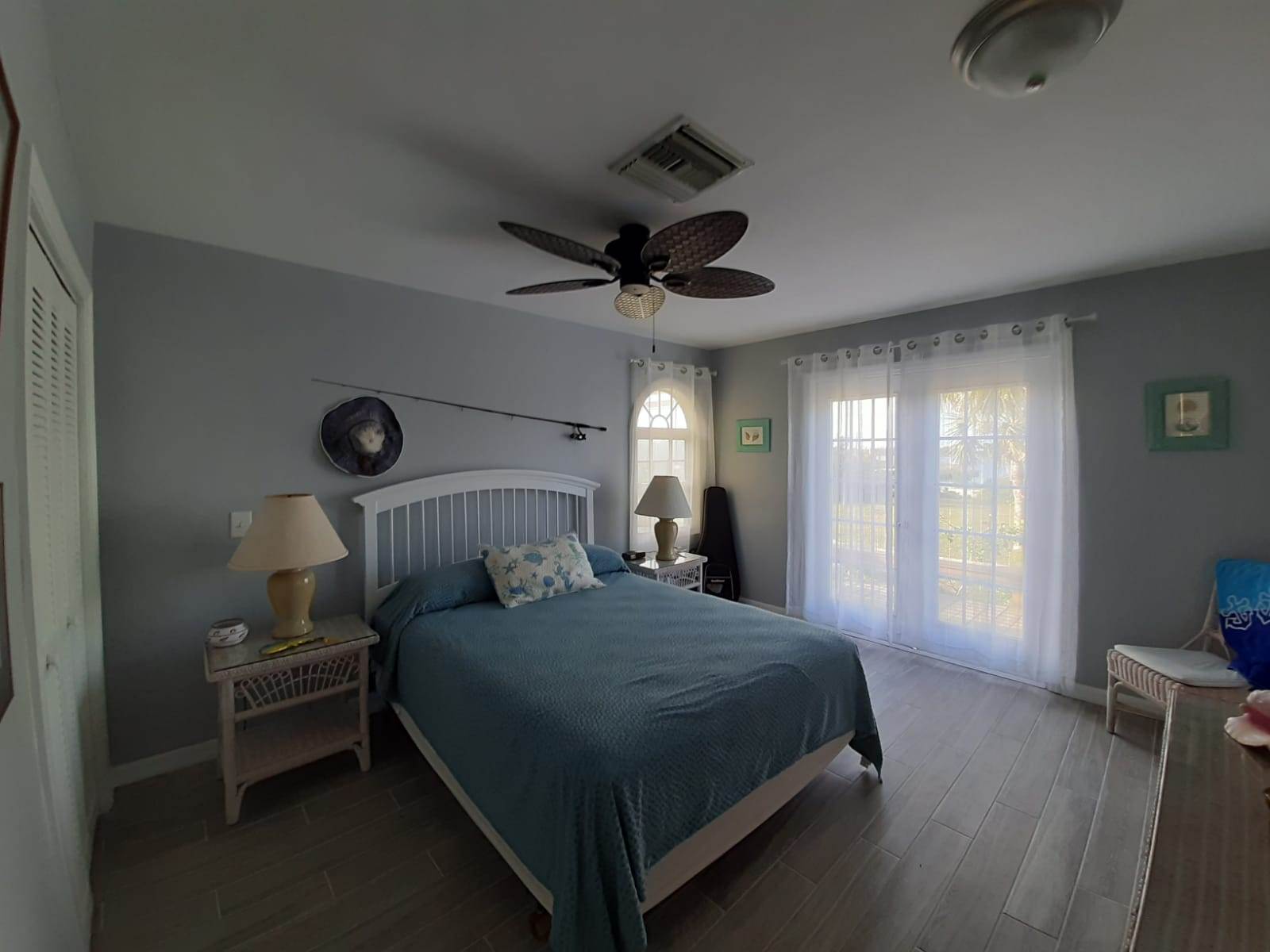 The heart of Oleander is the expansive, open-plan kitchen, dining, and living area, designed for social flow and bathed in natural light. Three matching sets of French doors line this space, leading directly out onto the deck, where the stunning views of White Sound Harbour take center stage. The kitchen is fully equipped with every essential, including a full-size stove, large fridge/freezer, dishwasher, and microwave. The living room provides two large, comfortable sofas for relaxing while enjoying the views or the large television.