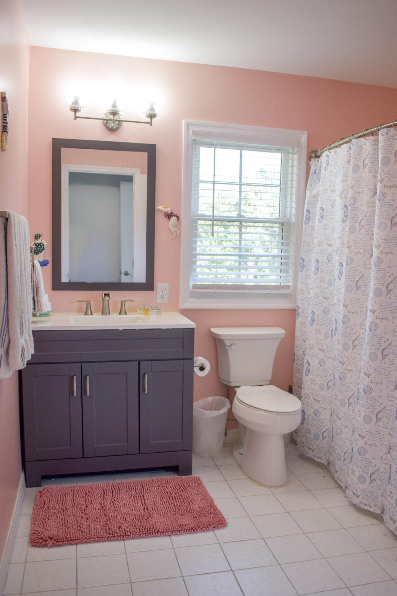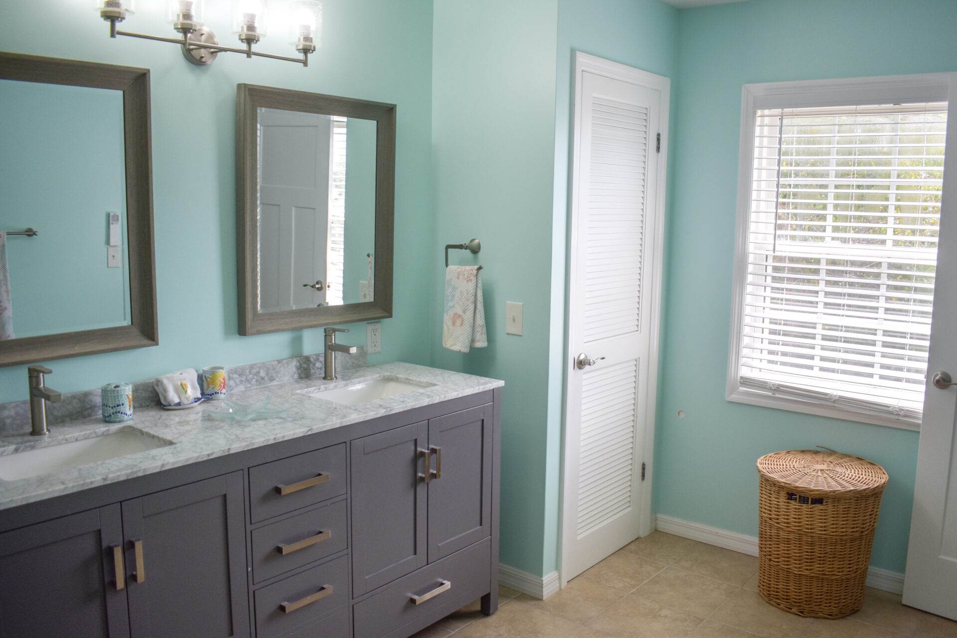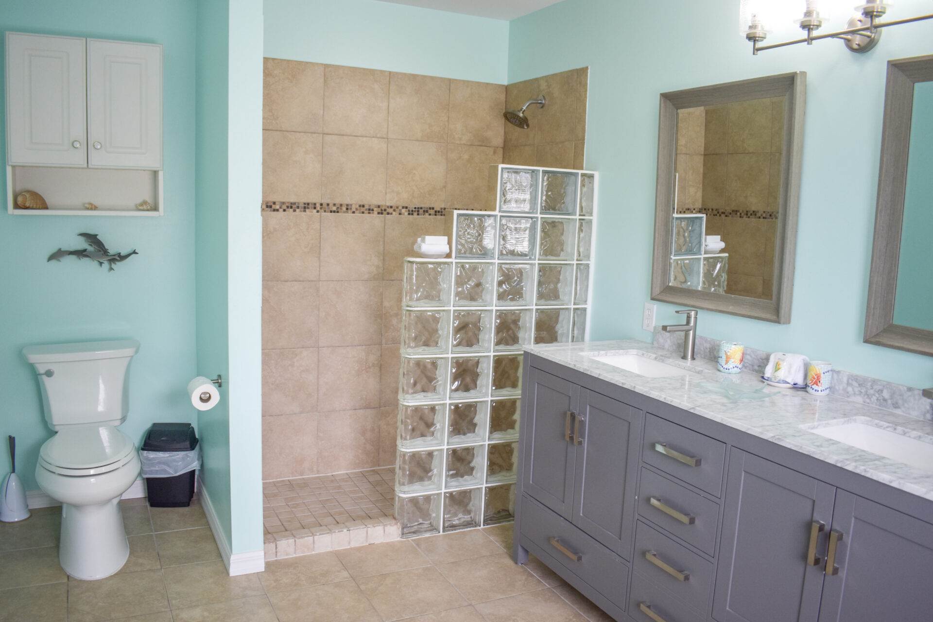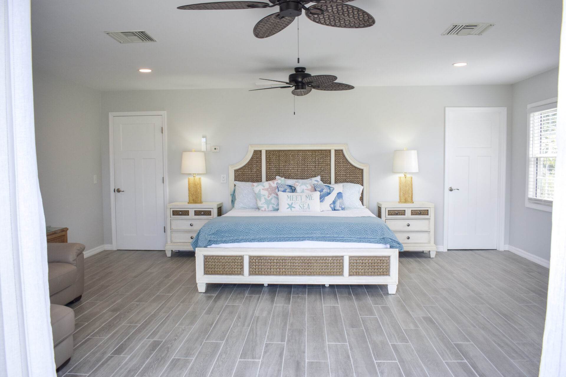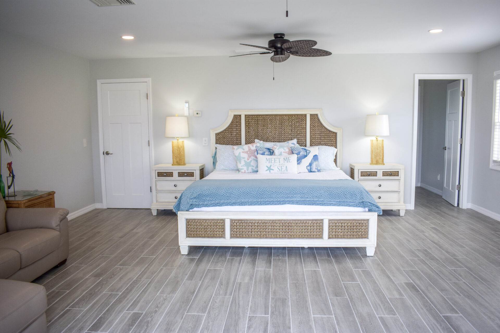 All three bedrooms offer guests a private, ensuite experience. The spacious Master Suite features a King-sized bed, a generous walk-in closet, and a luxurious ensuite bathroom with a walk-in shower and a Jack and Jill sink. The two remaining bedrooms, located at the opposite end of the house for maximum privacy, are identical, each boasting a Queen-sized bed and a full ensuite bathroom complete with a tub. All bedrooms also benefit from private French doors leading directly onto the harbor-view deck.
