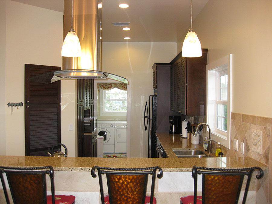 Washer and dryer are located on the main floor next to the fully fitted kitchen, which offers a gas stove, stainless steel appliances and granite countertops. The dining room table can be expanded to accommodate 8 people, with additional seating for 4 at the bar.