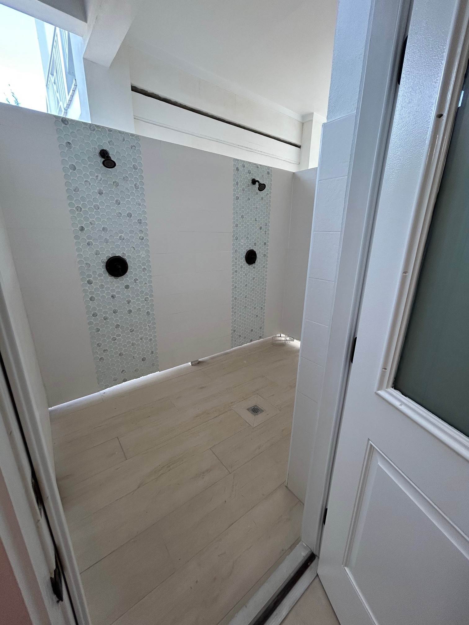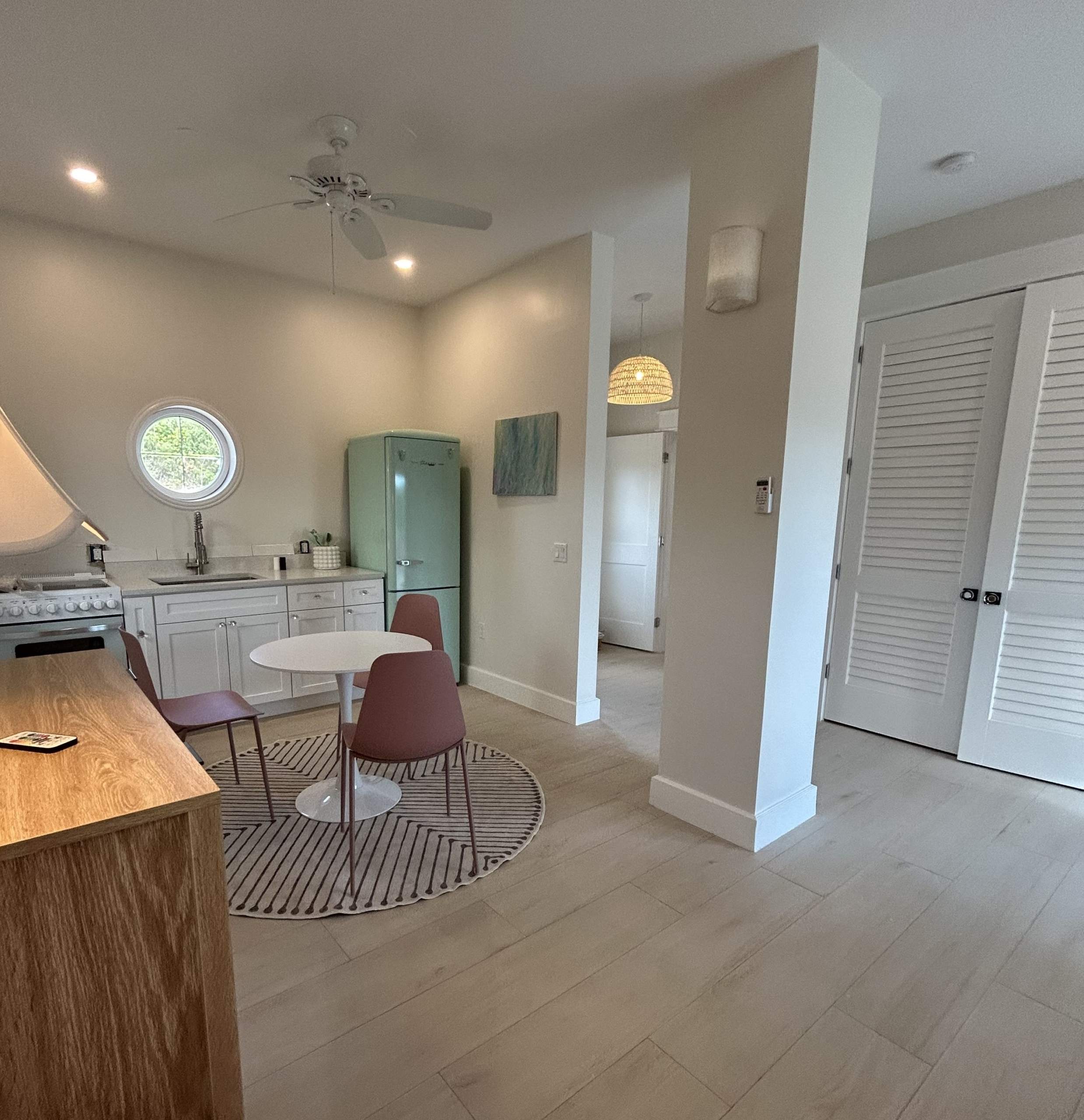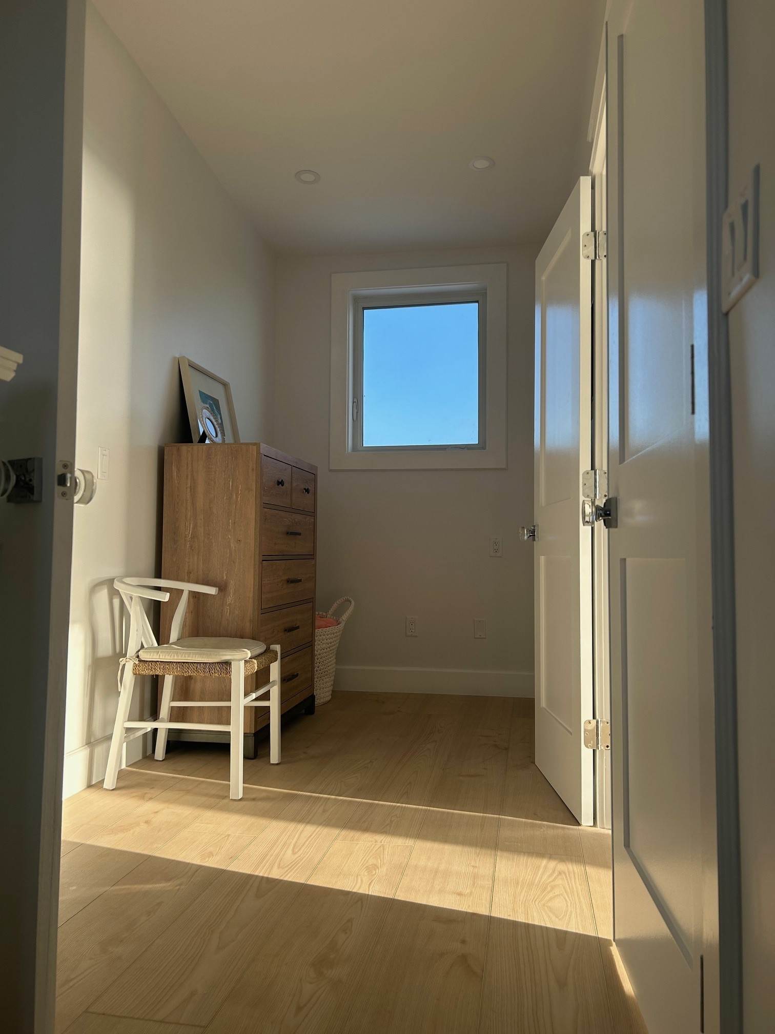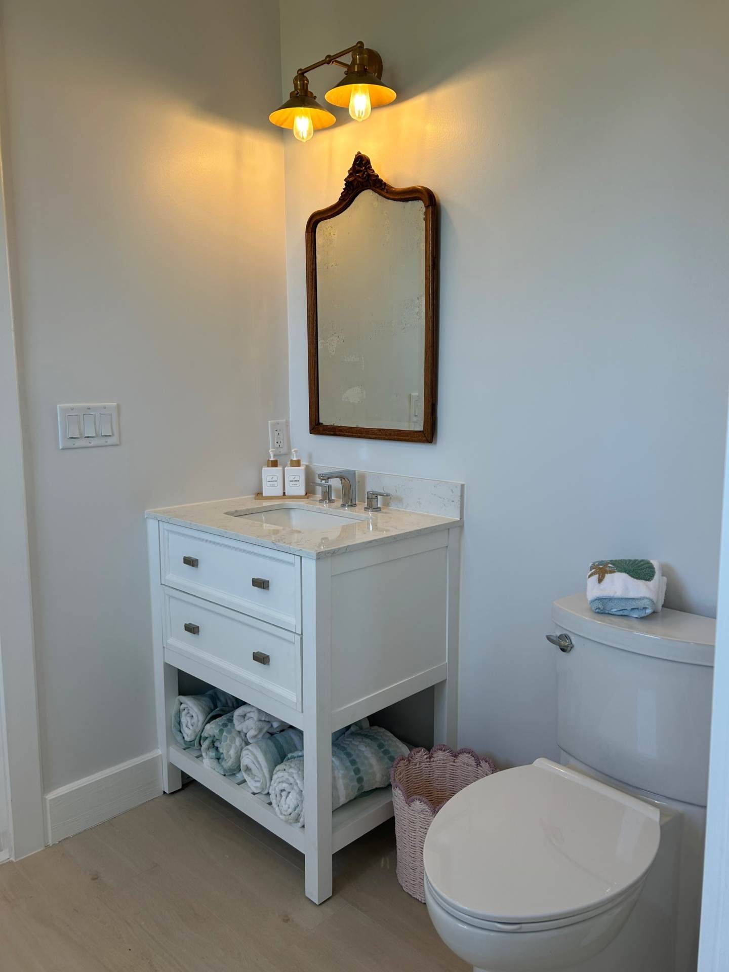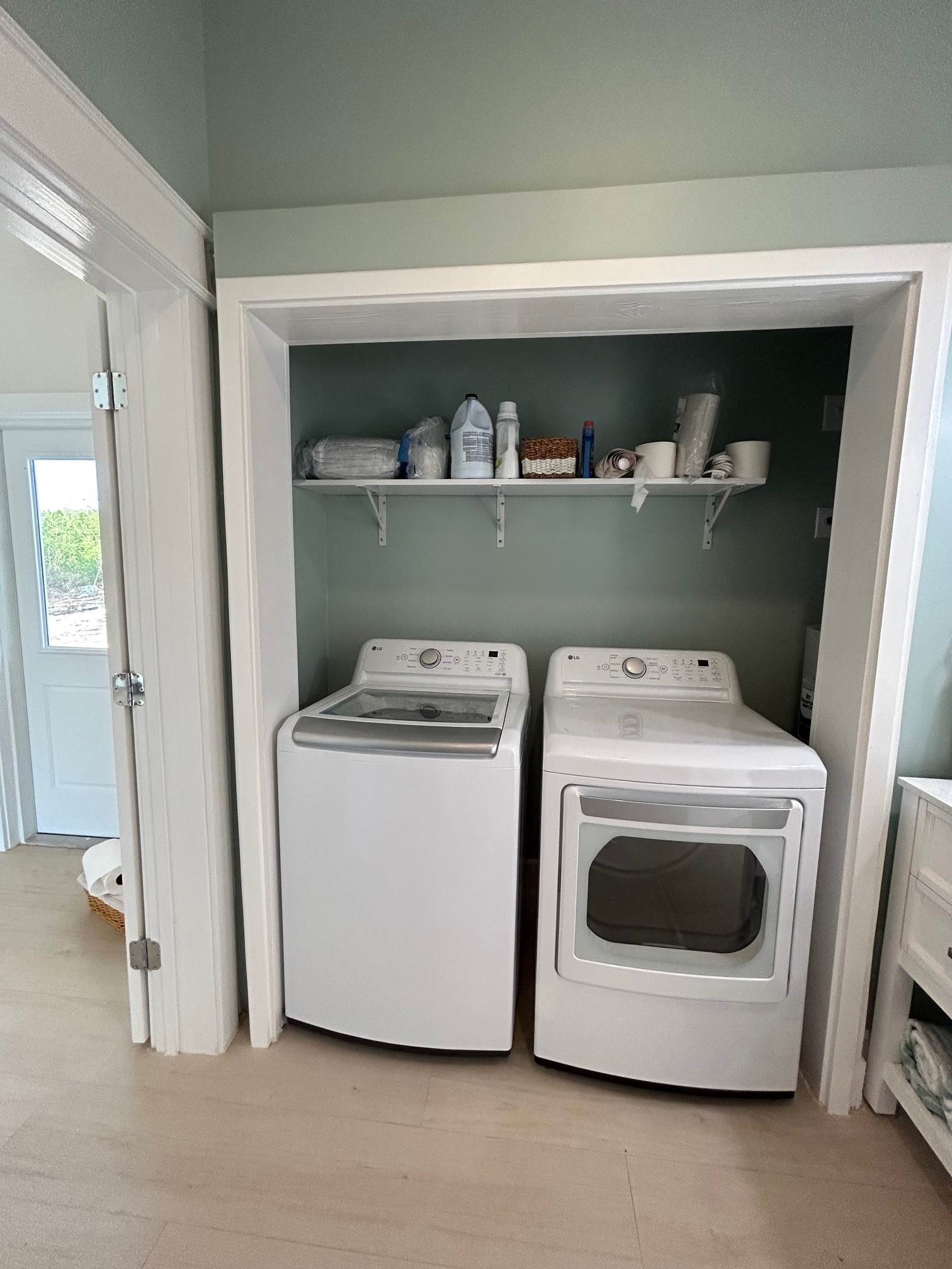 For guests seeking maximum privacy, the Lower-Level Private Suite acts as a self-contained apartment, accessed via outdoor steps. This suite includes a Queen-size bed, two twin bunk beds (ideal for children), a dedicated kitchenette with a 24-inch electric stove, fridge, freezer, coffee maker, and toaster, and a private bathroom. Sliding doors open onto a 26x10-foot tiled deck—a perfect spot to enjoy the ocean breeze. This level also provides practical necessities, including the main laundry facilities and a convenient double outdoor shower.