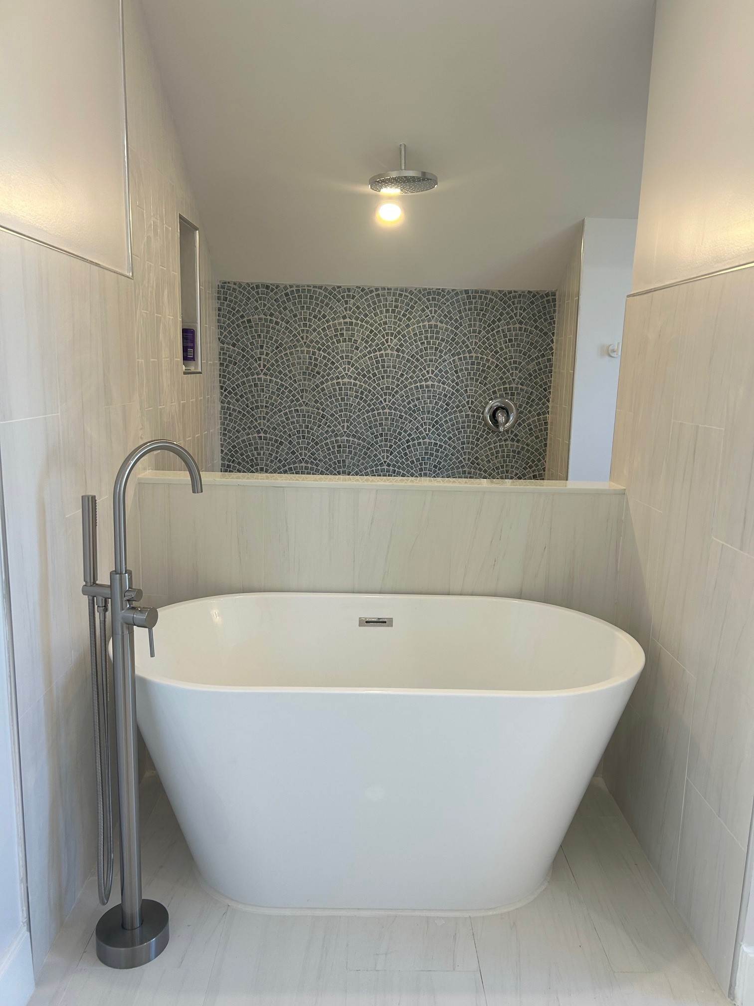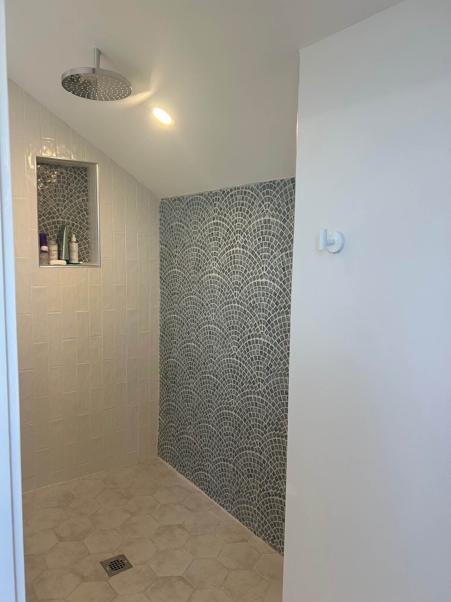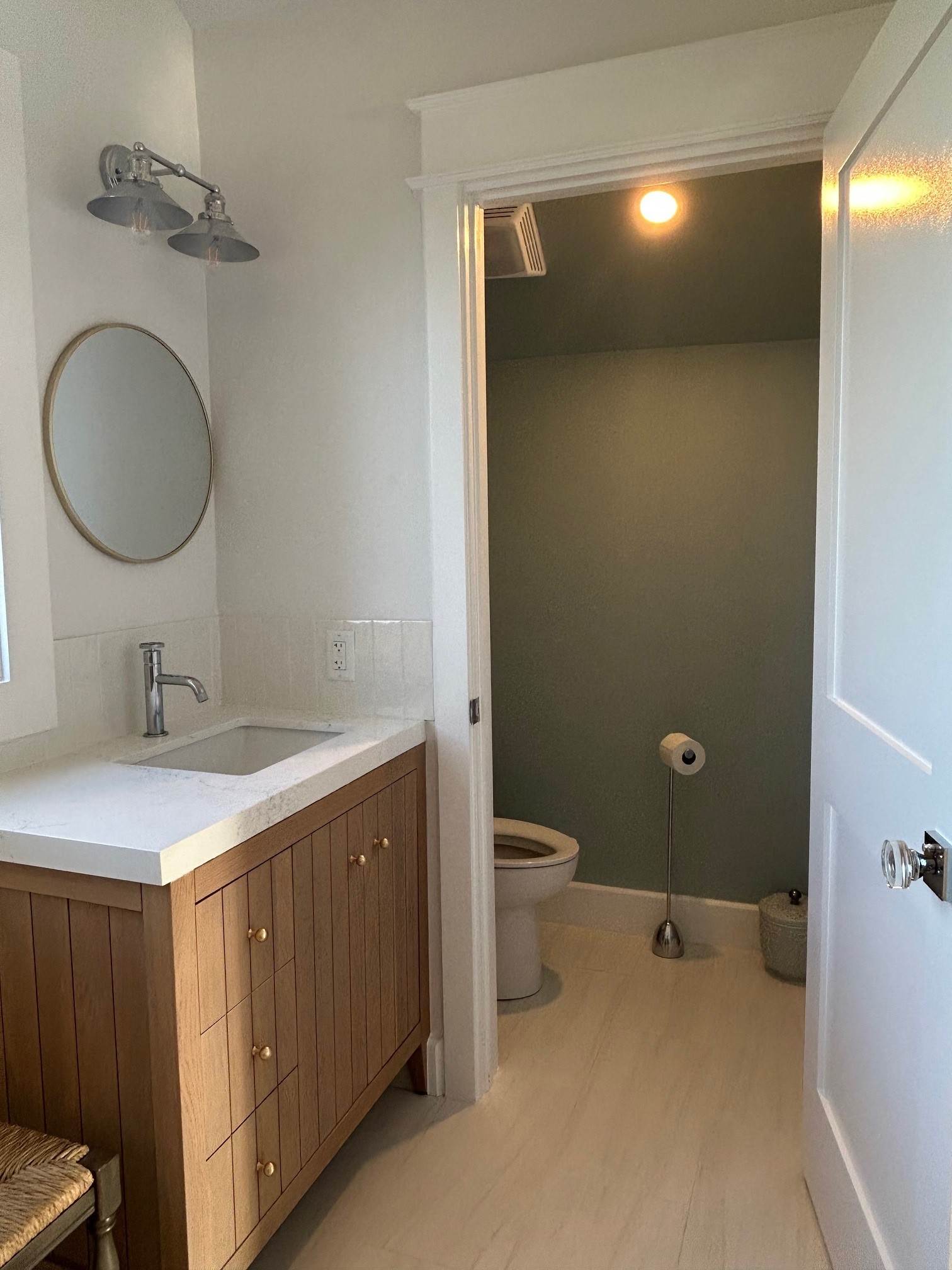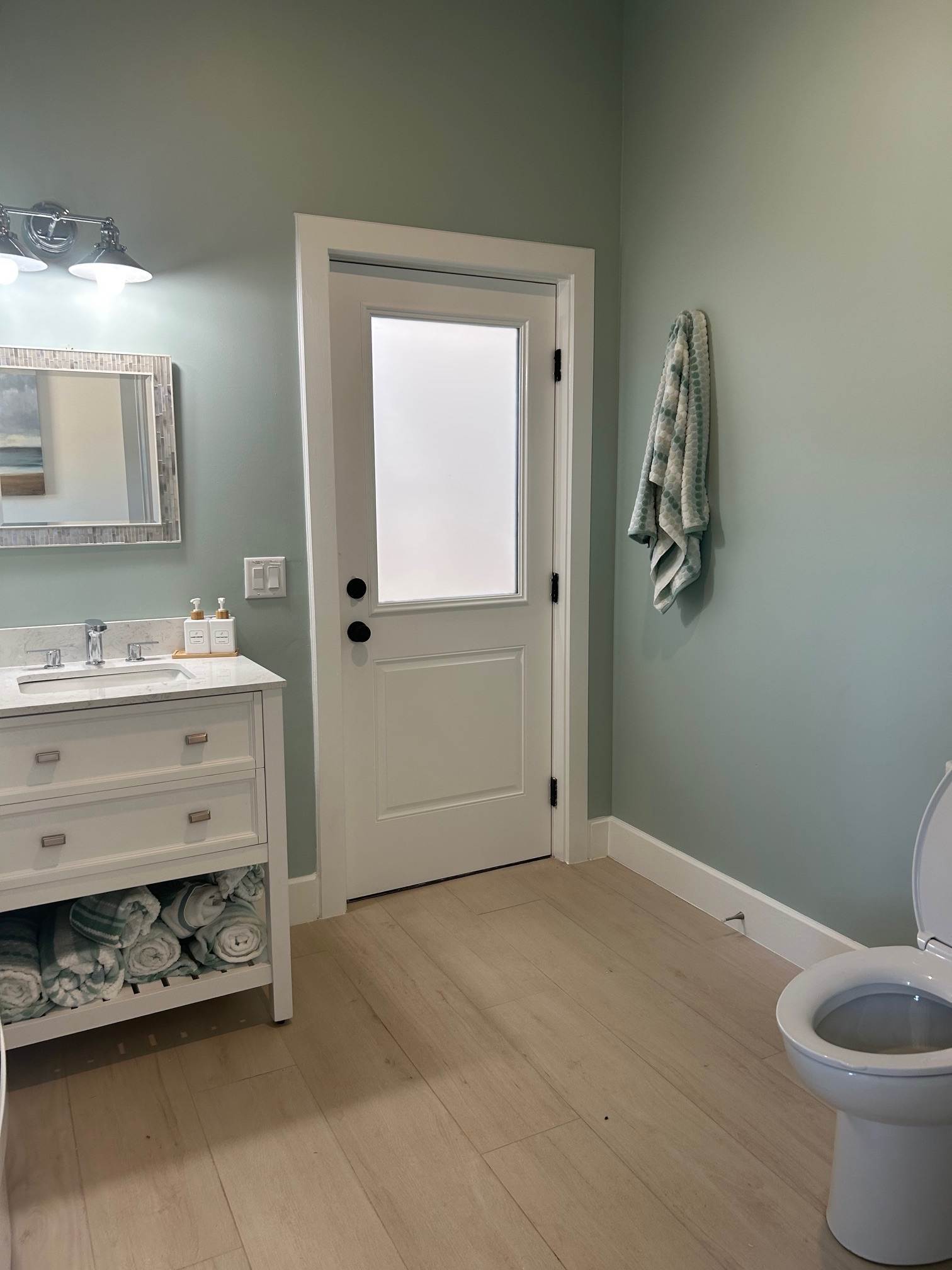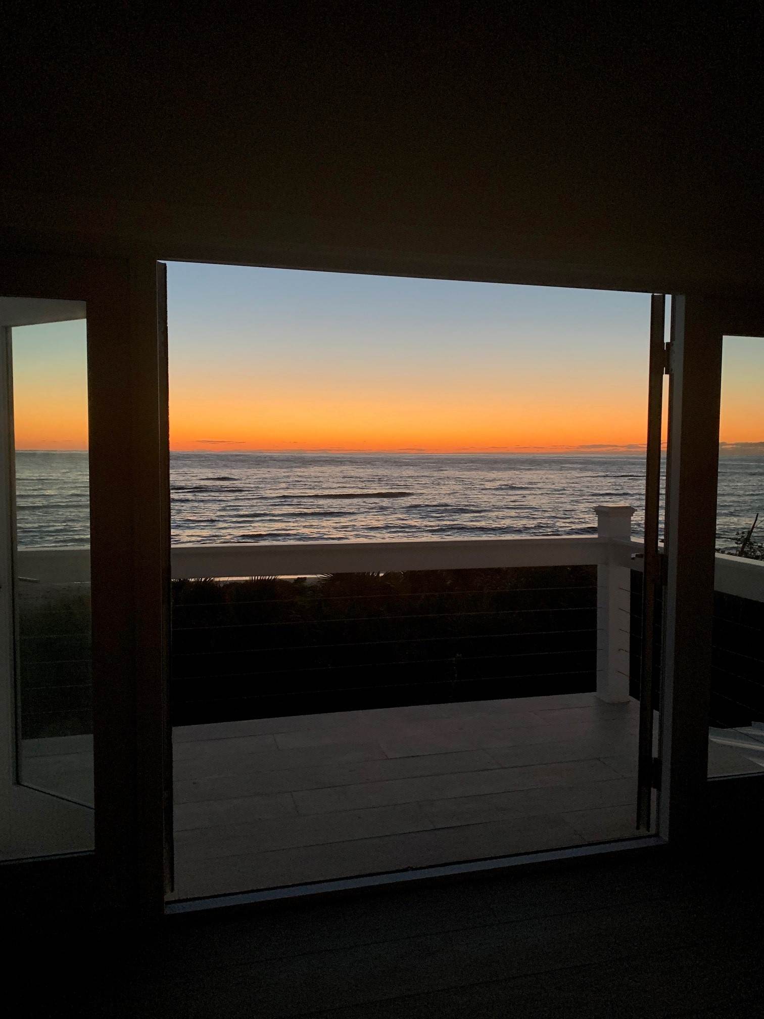 For guests seeking maximum privacy, the Lower-Level Private Suite acts as a self-contained apartment, accessed via outdoor steps. This suite includes a Queen-size bed, two twin bunk beds (ideal for children), a dedicated kitchenette with a 24-inch electric stove, fridge, freezer, coffee maker, and toaster, and a private bathroom. Sliding doors open onto a 26x10-foot tiled deck—a perfect spot to enjoy the ocean breeze. This level also provides practical necessities, including the main laundry facilities and a convenient double outdoor shower.