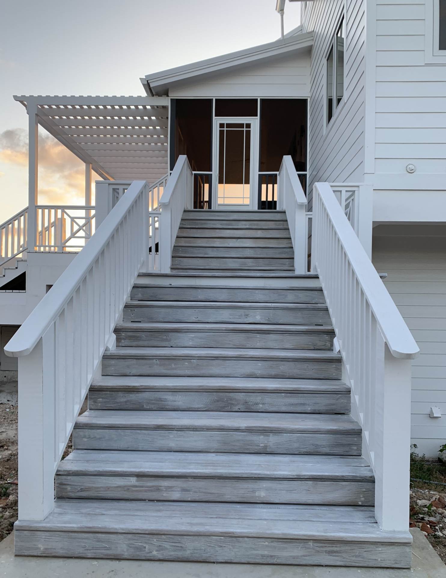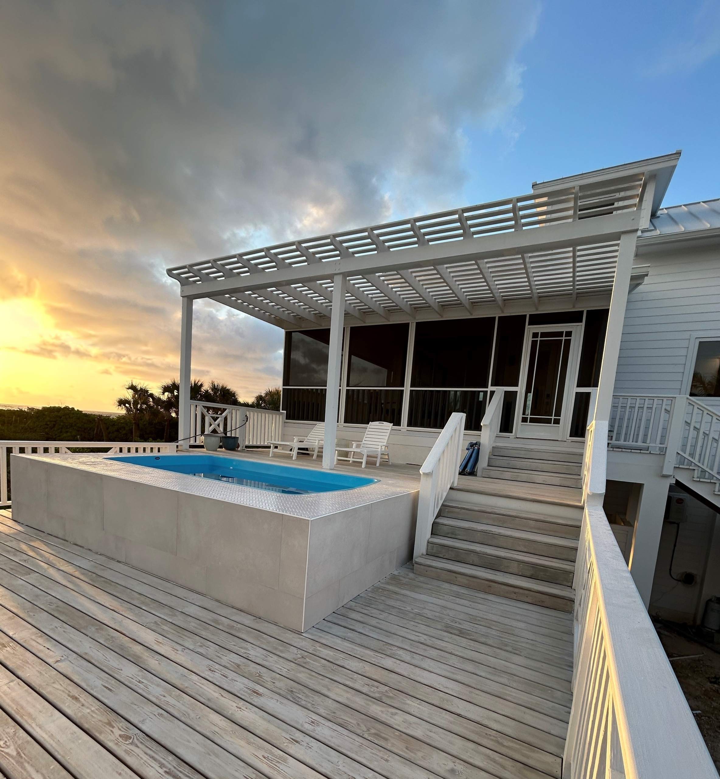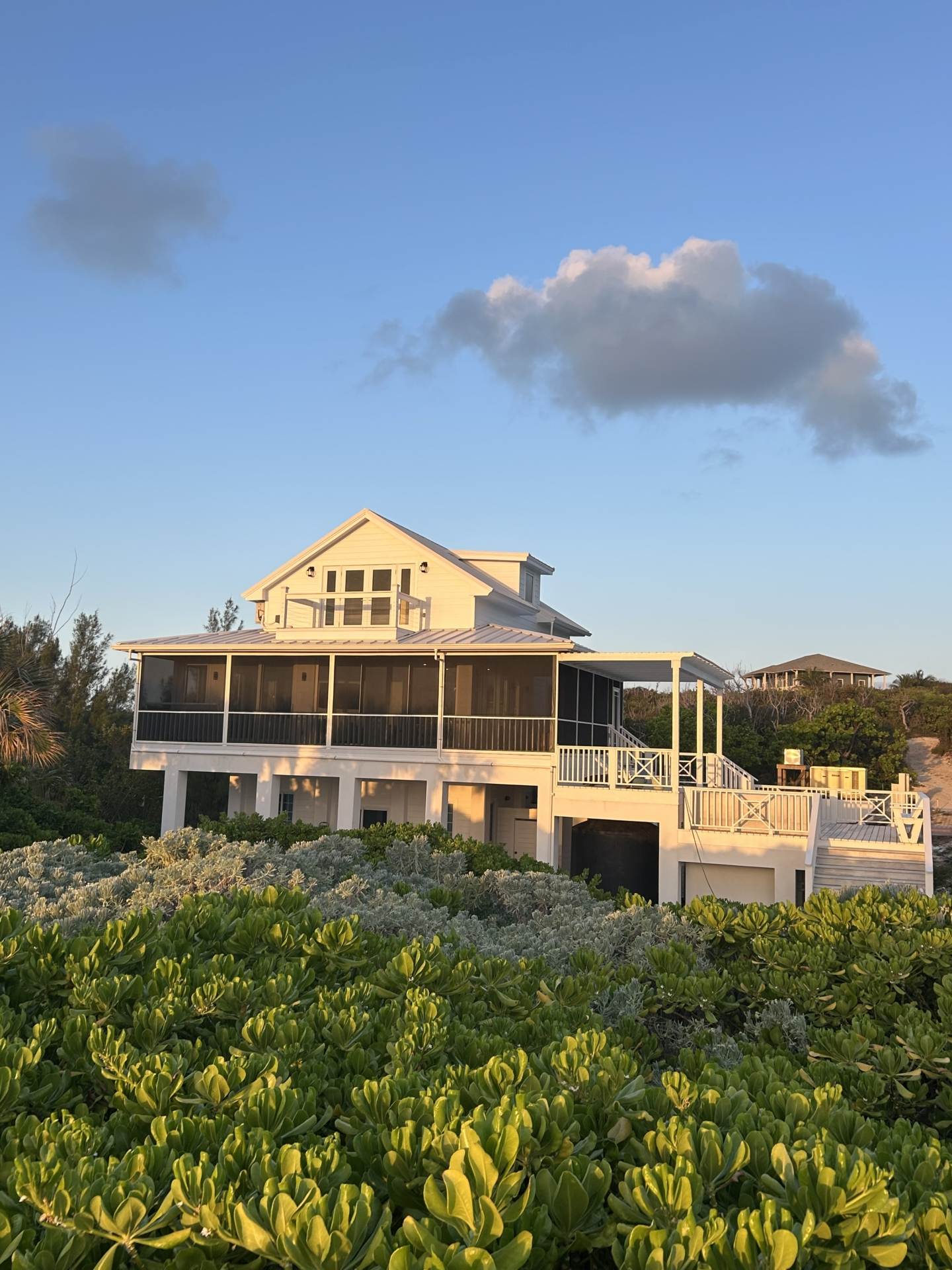 The exterior grounds are a true paradise, featuring a private swimming pool surrounded by expansive sun decks and shaded, screened-in porches—perfect for luxurious lounging or peaceful afternoon reads. A private beach path leads directly from the house to the sand, placing the crystal-clear ocean just steps away.