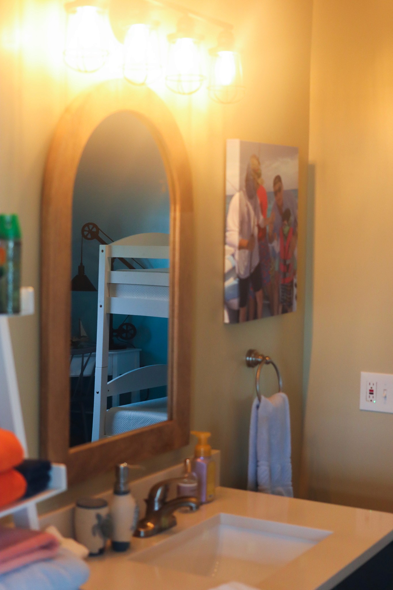 Upstairs, two master bedrooms await, each adorned with a luxurious queen bed, offering peaceful havens to retreat at day's end. Downstairs, a spacious bedroom features four cozy bunk beds, ideal for families with children, and each bedroom boasts its own full bathroom for added convenience.